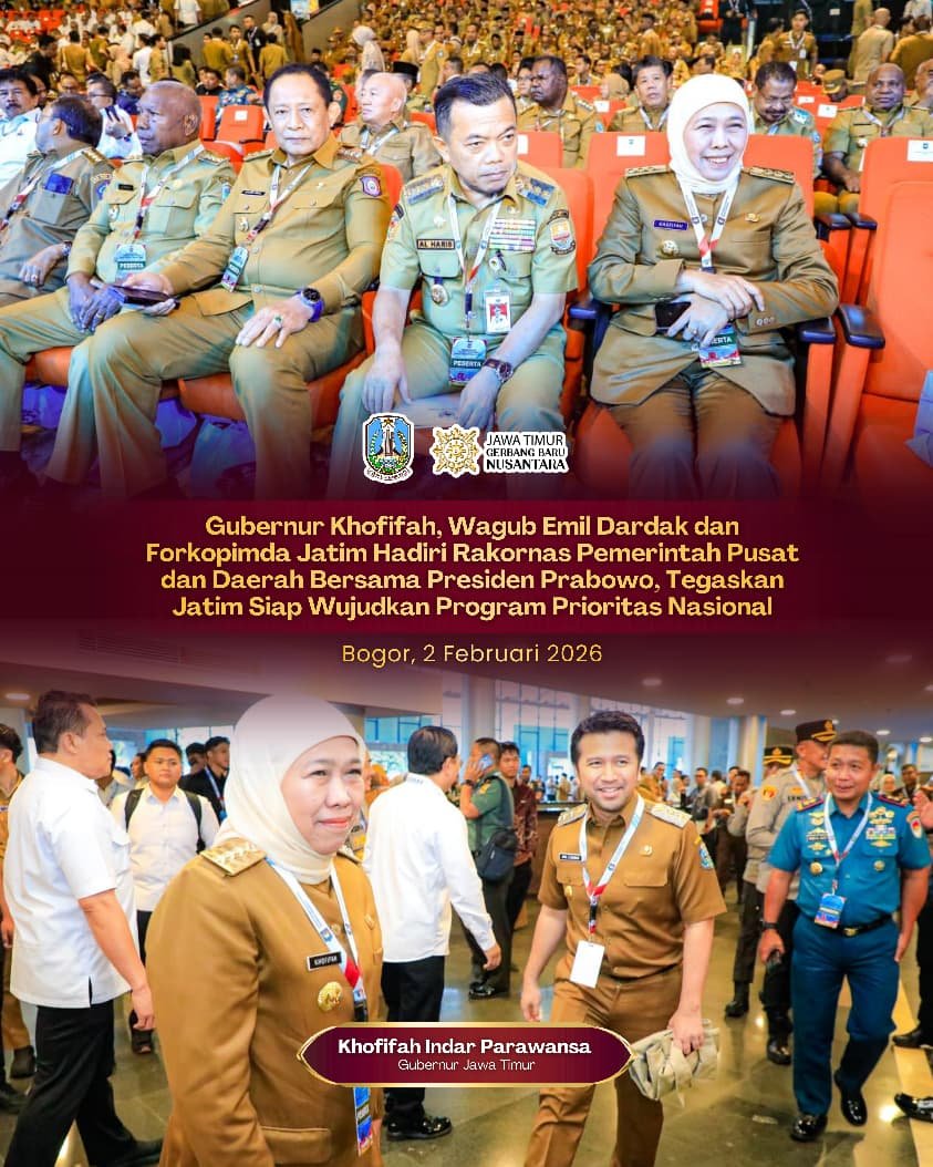 SENTUL.SabdaNews.com – Gubernur Jawa Timur Khofifah Indar Parawansa, Wakil Gubernur Jatim Emil Elestianto Dardak, dan Forkopimda Jatim menghadiri Rapat Koordinasi Nasional (Rakornas) Pemerintah Pusat dan Daerah yang dipimpin langsung oleh Presiden Republik Indonesia Prabowo Subianto di Sentul Internasional Convention Center di Bogor, Jawa Barat, Senin (2/2/2026).