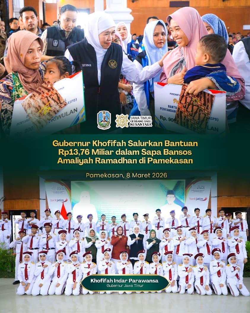 PAMEKASAN.SabdaNews.com  – Gubernur Jawa Timur Khofifah Indar Parawansa menyalurkan berbagai bantuan sosial dan tali asih kepada masyarakat Kabupaten Pamekasan dengan total nilai mencapai Rp13.760.750.000 melalui program Sapa Bansos Amaliyah Ramadhan 1447 H.