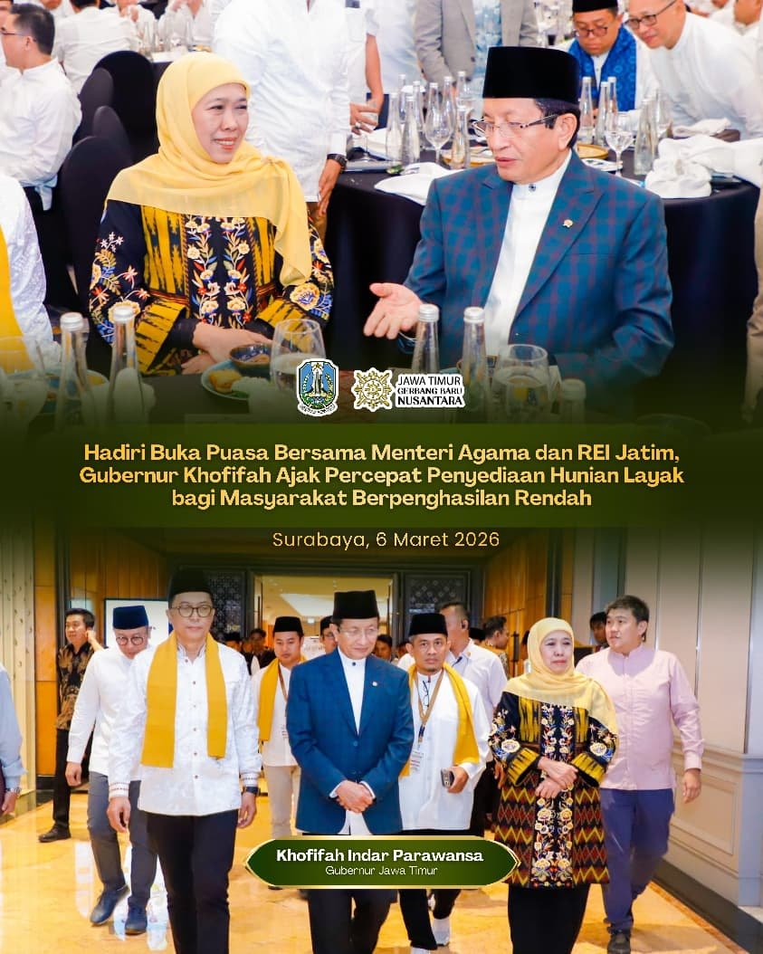 Ajakan tersebut disampaikan Gubernur Khofifah usai menghadiri kegiatan berbuka puasa bersama yang diselenggarakan DPD REI Jawa Timur di Sheraton Surabaya Hotel & Towers, Jumat (6/3/2026) kemarin.