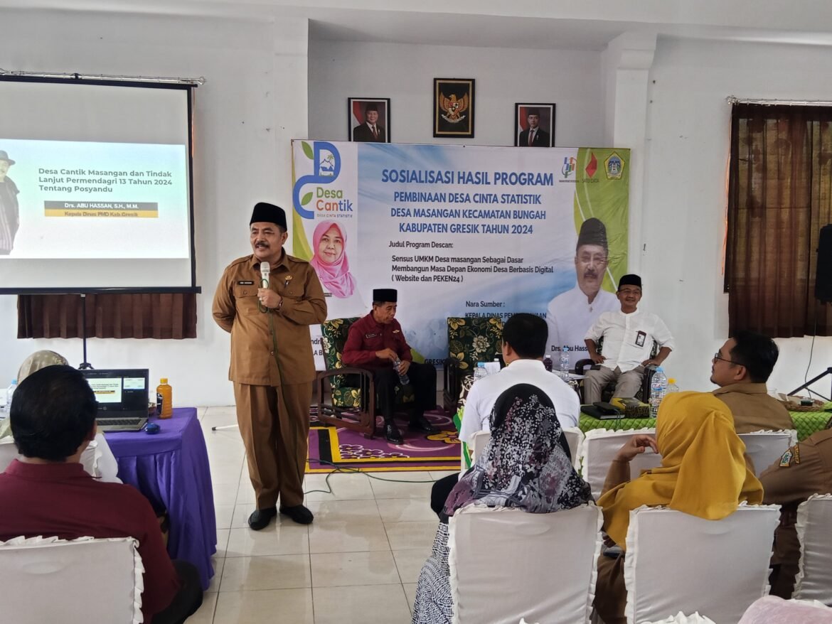 Kepala Dinas PMD Gresik Abu Hassan mengatakan, pembinaan Desa Cantik di Masangan ini bertujuan agar data statistik yang sudah dikelola oleh aparatur desa bisa dikembangkan demi memajukan, memberdayakan dan mensejahterakan masyakat khususnya UMKM.