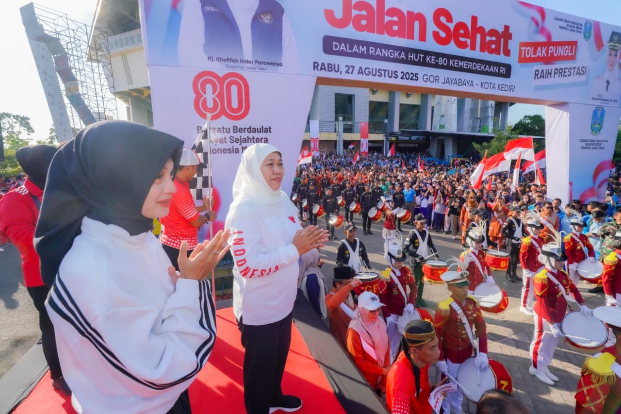 KEDIRI.SabdaNews.com – Gubernur Jawa Timur Khofifah Indar Parawansa bersama Wali Kota Kediri Vinanda Prameswati melepas 21 ribu peserta Jalan Sehat Guru dan Murid SMA/SMK/SLB Negeri dan Swasta Wilayah Kediri di GOR Joyoboyo, Rabu (27/8/2025).