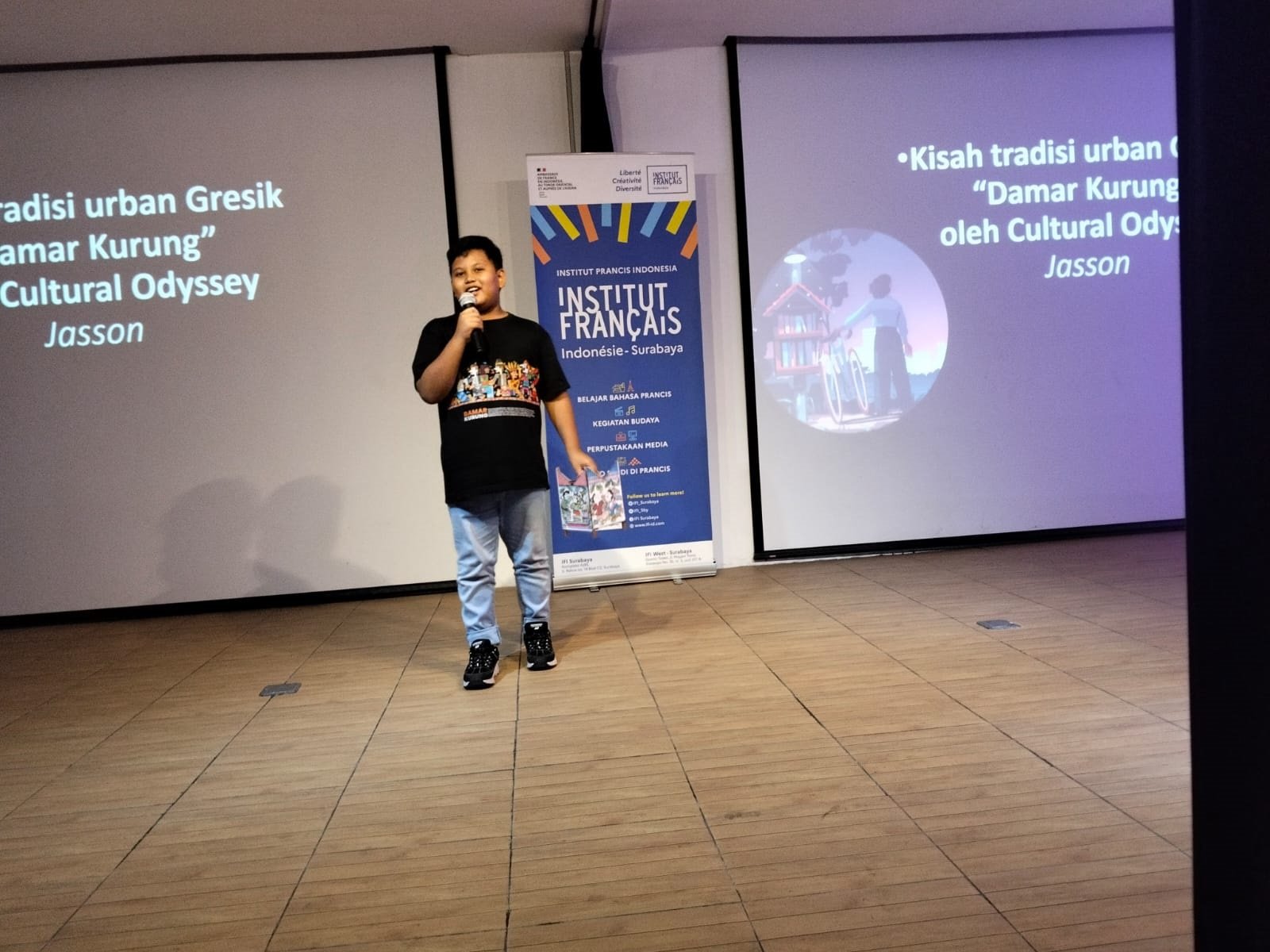 SURABAYA, SabdaNews.com- Jasson , salah satu siswa kelas 3 SDN Petrokimia Gresik tampil percaya diri menggunakan bahasa Inggris di auditorium IFI, Pusat Kebudayaan Prancis. Jumat sore (23/1/2026). Meski baru kelas 3 SDN, namun bisa bercerita soal damar kurung tanpa menggunakan bantuan kertas ataupun smart phone. ” Hanya punya waktu 3 hari untuk menyiapkan damar kurung dan juga busana pendukung, serta mencari literatur dari damarkurung”,tegas ibunya Jasson.
