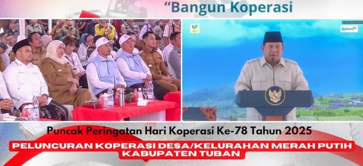 TUBAN.SabdaNews.com – Gubernur Jawa Timur Khofifah Indar Parawansa menegaskan bahwa Jatim menjadi provinsi terbanyak dan tercepat menuntaskan 100 persen kelembagaan Koperasi Desa/Kelurahan Merah Putih (KDKMP) di hadapan Presiden Prabowo Subianto saat peluncuran KDKMP secara daring dari KDMP Pucangan Kec. Montong Kabupaten Tuban, Senin (21/7/2025).