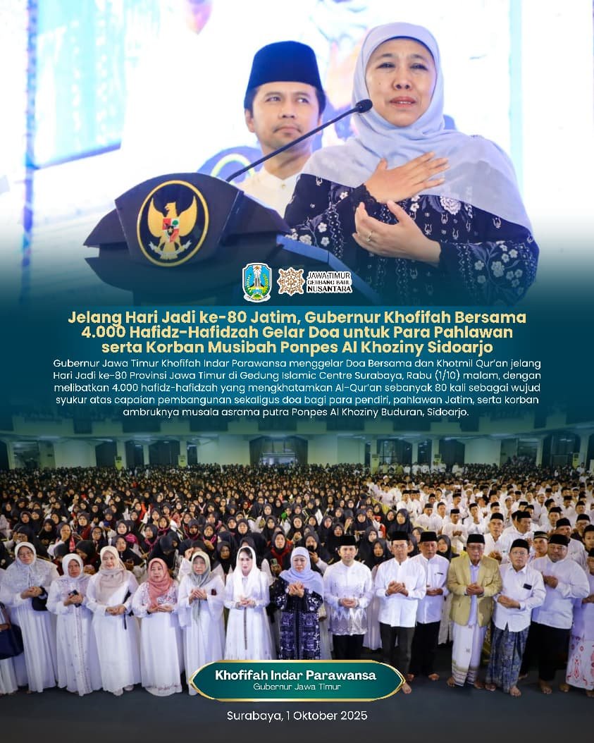 SabdaNews.com – Gubernur Jawa Timur Khofifah Indar Parawansa dan Wakil Gubernur Emil Elestianto Dardak menggelar Doa Bersama untuk Pendiri dan Pahlawan Jawa Timur serta Khotmil Qur’an dengan melibatkan 4.000 Hafidz-Hafidzah yang digelar di Gedung Islamic Centre, Surabaya, Rabu (1/10/2025) lalu.
