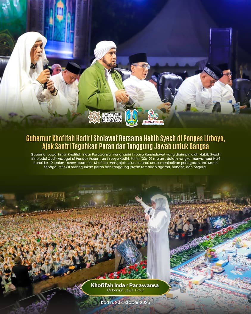 Dalam kesempatan tersebut, Gubernur Khofifah menyampaikan bahwa peringatan Hari Santri setiap 22 Oktober bukan sekadar seremoni tahunan, melainkan momentum refleksi untuk meneguhkan kembali peran, tanggung jawab, dan kontribusi santri terhadap bangsa, negara dan agama.