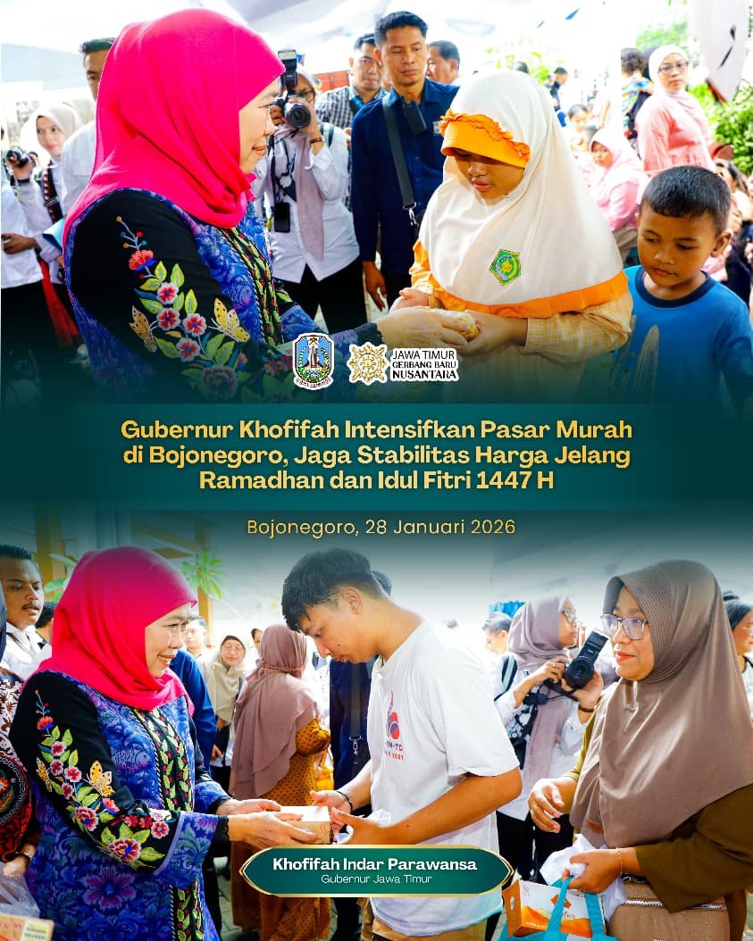 BOJONEGORO.SabdaNews.com – Gubernur Jawa Timur Khofifah Indar Parawansa terus mengintensifkan upaya stabilisasi harga bahan pokok menjelang Bulan Suci Ramadhan dan Hari Raya Idul Fitri 1447 Hijriah. Salah satu langkah konkret tersebut diwujudkan melalui penyelenggaraan Pasar Murah yang kali ini digelar di halaman Kantor Kelurahan Klangon, Kecamatan Bojonegoro Kota, Kabupaten Bojonegoro, Rabu (28/1/2026).