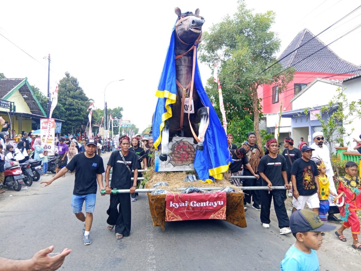 Tampak seluruh peserta tampil dengan berbagai kostum menarik. Mereka juga menampil berbagai tema ornamen, seperti halnya pajangan komodo, harimau putih, buto ijo, burung garuda, kuda, kambing etawa hingga tikus kantor. Para peserta berangkat dari rute awal Dusun Grogol, menuju Masangan Barat, Masangan Tengah, Masangan Timur dan berakhir di Balai Desa. Sepanjang perjalanan, para peserta juga melakukan berbagai atraksi.(gus/Red)