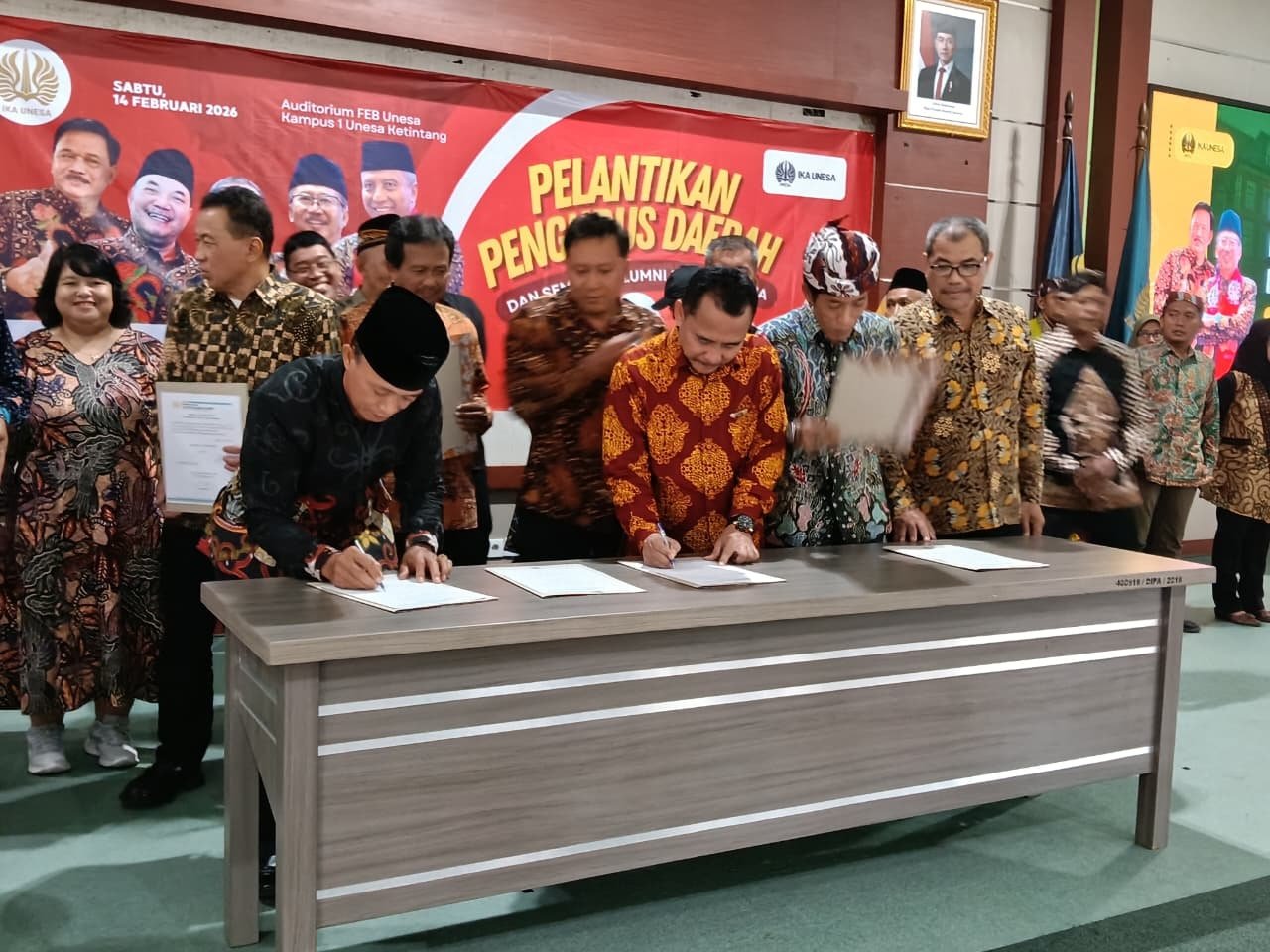 GRESIK ,SabdaNews.com- Kadispendik (Kepala Dinas Pendidikan) Kabupaten Gresik Dr. H. S. Hariyanto, S.Pd., M.M Resmi Dilantik Jadi Ketua Umum IKA Unesa Cabang Gresik. Sementara Dr. Nyai Hj. Aminatun Habibah, M.P.d, yang pernah menjabat sebagai Wakil Bupati (Wabup) Gresik sebagai Ketua Dewan Pembina. Pelantikan dilakukan langsung oleh Ketua Umum Pengurus Pusat (PP) IKA Unesa, Bambang DH bersama 14 pengurus cabang IKA Unesa periode 2026–2031 di Auditorium Fakultas Ekonomi dan Bisnis, Kampus I Ketintang, Universitas Negeri Surabaya, Sabtu (14/2/2026).