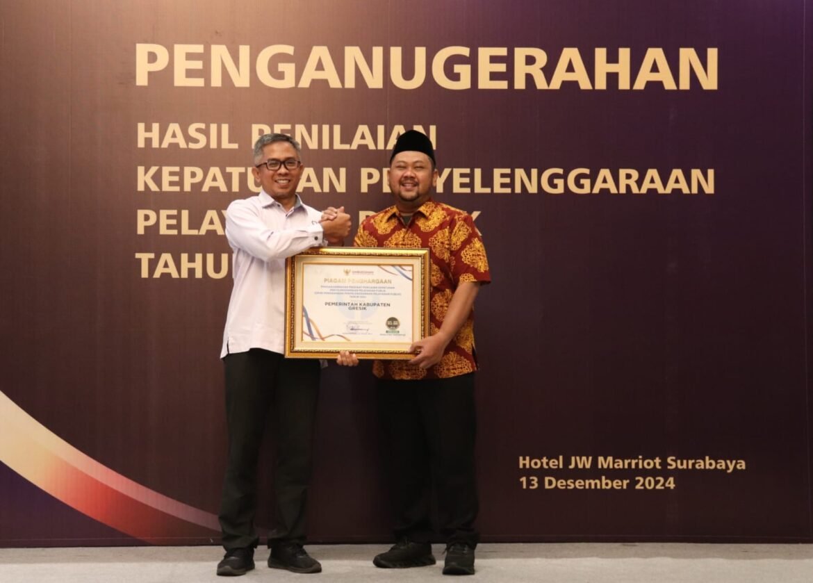 Penghargaan tersebut diberikan oleh Ombudsman Republik Indonesia (ORI) Jawa Timur dalam acara Penganugerahan Hasil Penilaian Kepatuhan Penyelenggaraan Pelayanan Publik 2024 yang berlangsung di JW Marriot Hotel, Surabaya, Jumat (13/12/2024).