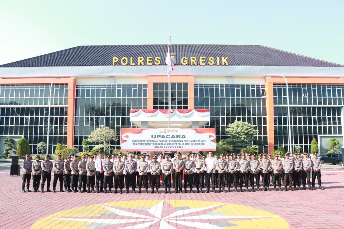 GRESIK, SabdaNews.com – Kapolres Gresik AKBP Rovan Richard Mahenu memimpin langsung upacara Korp Raport Kenaikan Pangkat Pengabdian dan pemberian penghargaan bagi personel Polri berprestasi, yang digelar pada Senin pagi (4/8/2025) di halaman Mapolres Gresik. Acara ini dihadiri oleh Wakapolres Kompol Danu Anindhito Kuncoro Putro, para Pejabat Utama (PJU), Kapolsek jajaran, serta seluruh anggota Polres Gresik. Suasana khidmat dan penuh semangat mewarnai jalannya upacara yang menjadi bentuk apresiasi institusi terhadap dedikasi dan prestasi anggotanya.