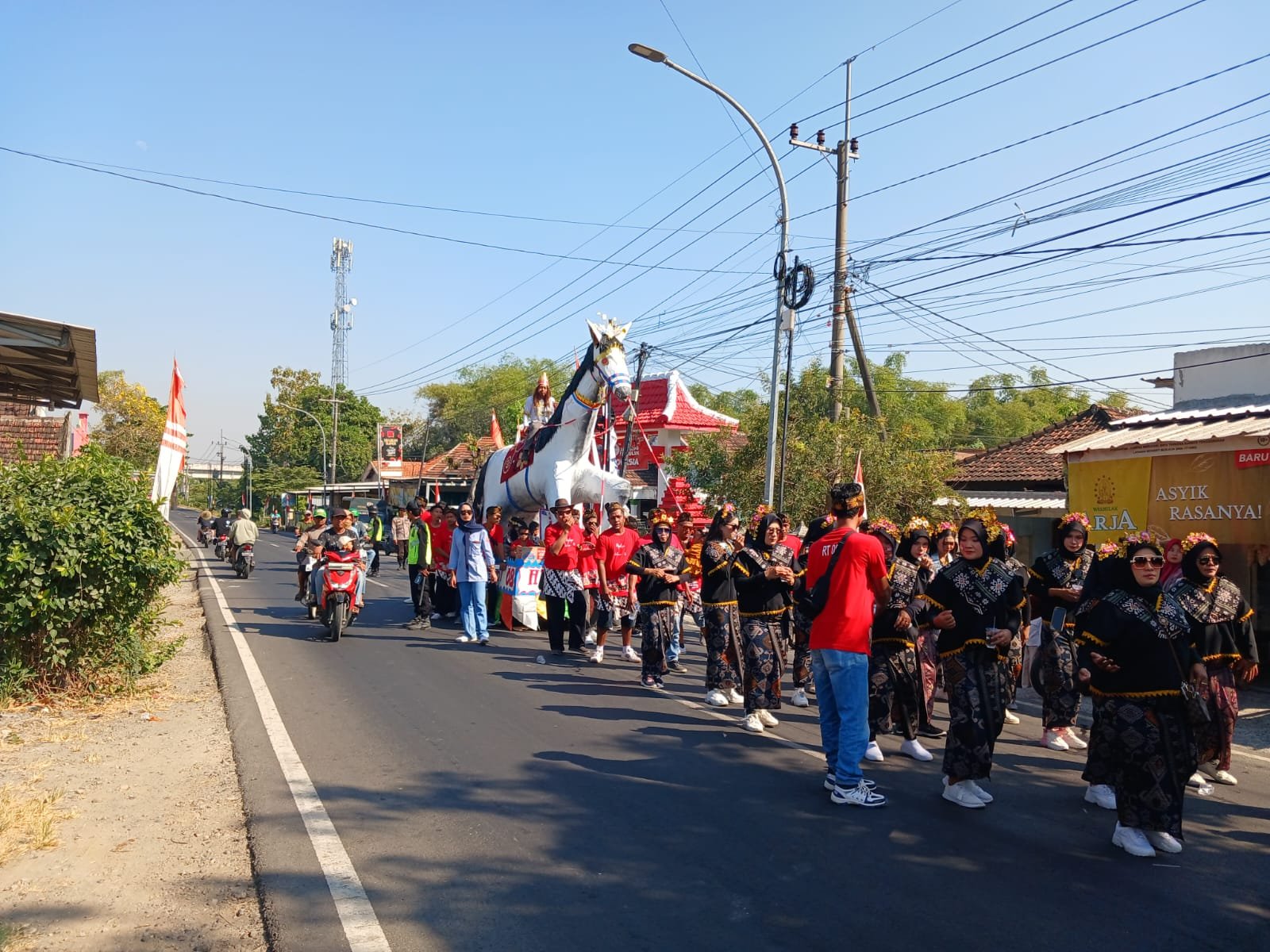 Sementara kelompok peserta yang mengusung adat Bali memilih membawa dupa, patung kuda pada adat Jawa, hingga miniatur Ibu Kota Negara (IKN) ditampilkan oleh kelompok yang mengusung adat Kalimantan.”Ini juga sekaligus masih dalam rangka acara sedekah bumi yang ada di desa kami,” kata Dwikora.