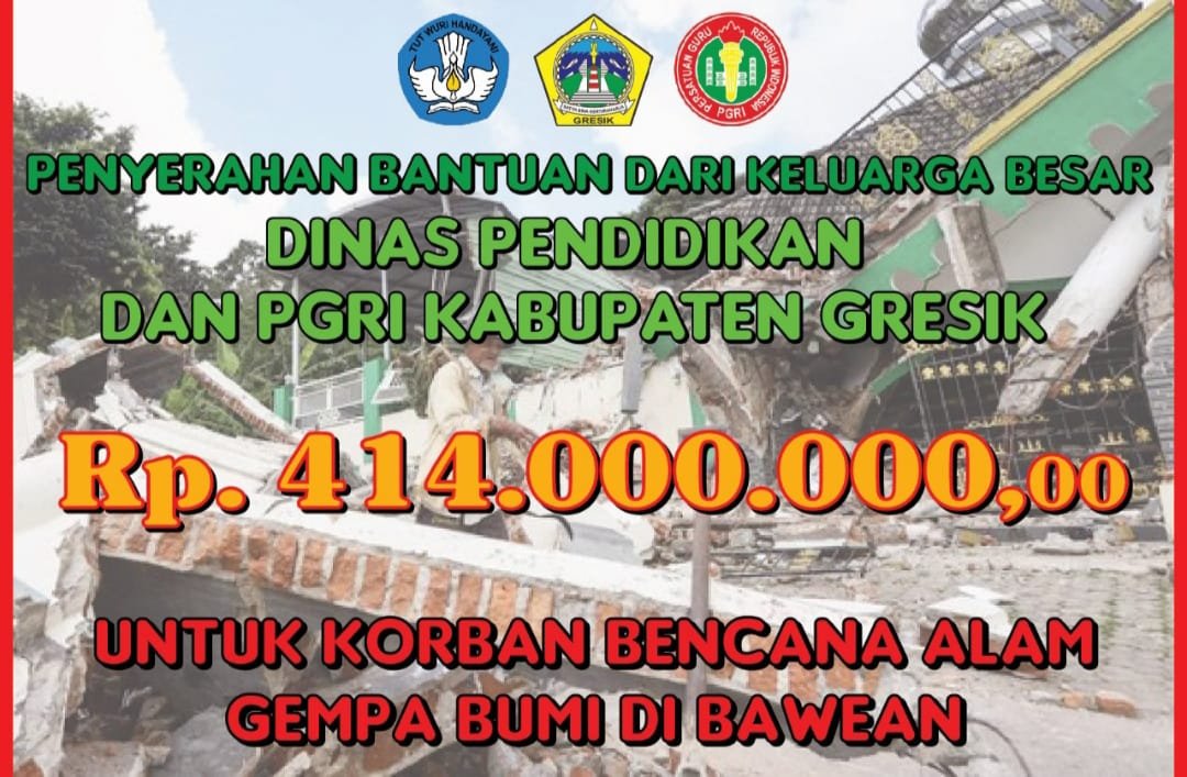 Kepala Dinas Pendidikan (Dispendik) Kabupaten Gresik S. Hariyanto, S.Pd, MM mengatakan, pihaknya turut prihatin atas musibah gempa bumi di Pulau Bawean. Untuk itu, sebagai wujud kepedulian, seluruh Keluarga Besar Dinas Pendidikan dan PGRI (Persatuan Guru Republik Indonesia) Kabupaten Gresik guyub rukun penuh persaudaraan menggalang donasi untuk disumbangkan kepada korban bencana gempa bumi di Pulau Bawean.