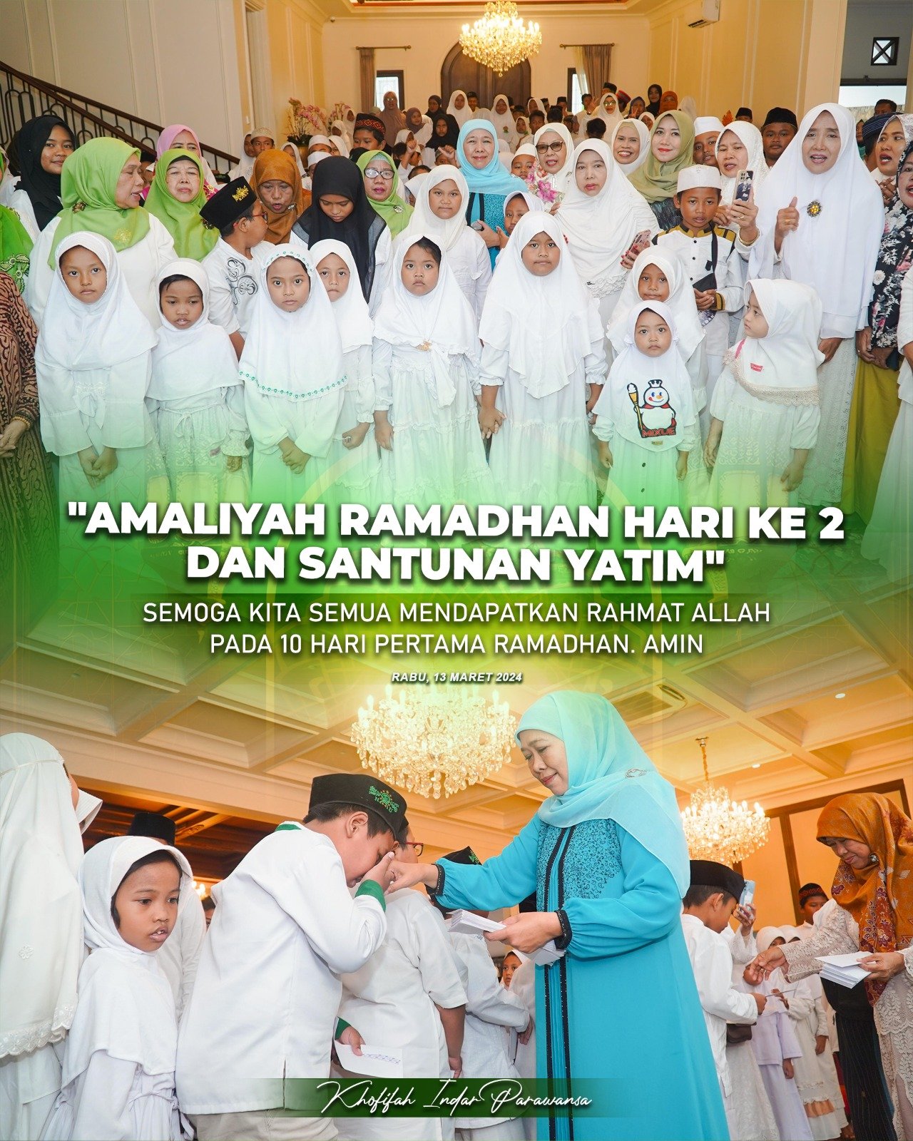 Untuk itu, dengan acuan tersebut maka Khofifah mengajak seluruh elemen masyarakat untuk menjadikan sedekah pada anak yatim menjadi amaliyah Ramadhan yang diistiqomahkan.