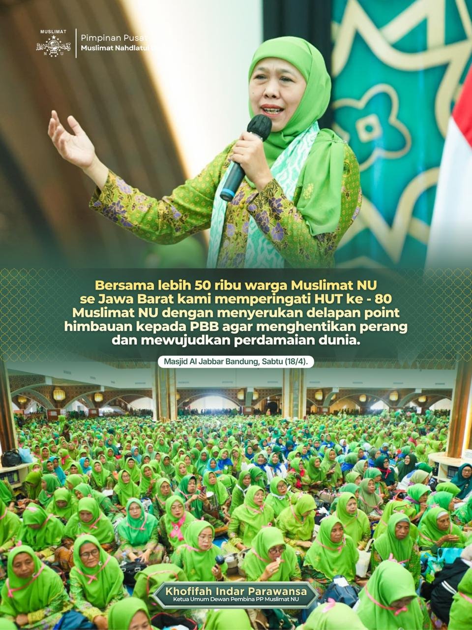 Khofifah Bersama Puluhan Ribu Muslimat NU Jabar Deklarasikan Seruan untuk PBB, Hentikan Perang Wujudkan Perdamaian Dunia