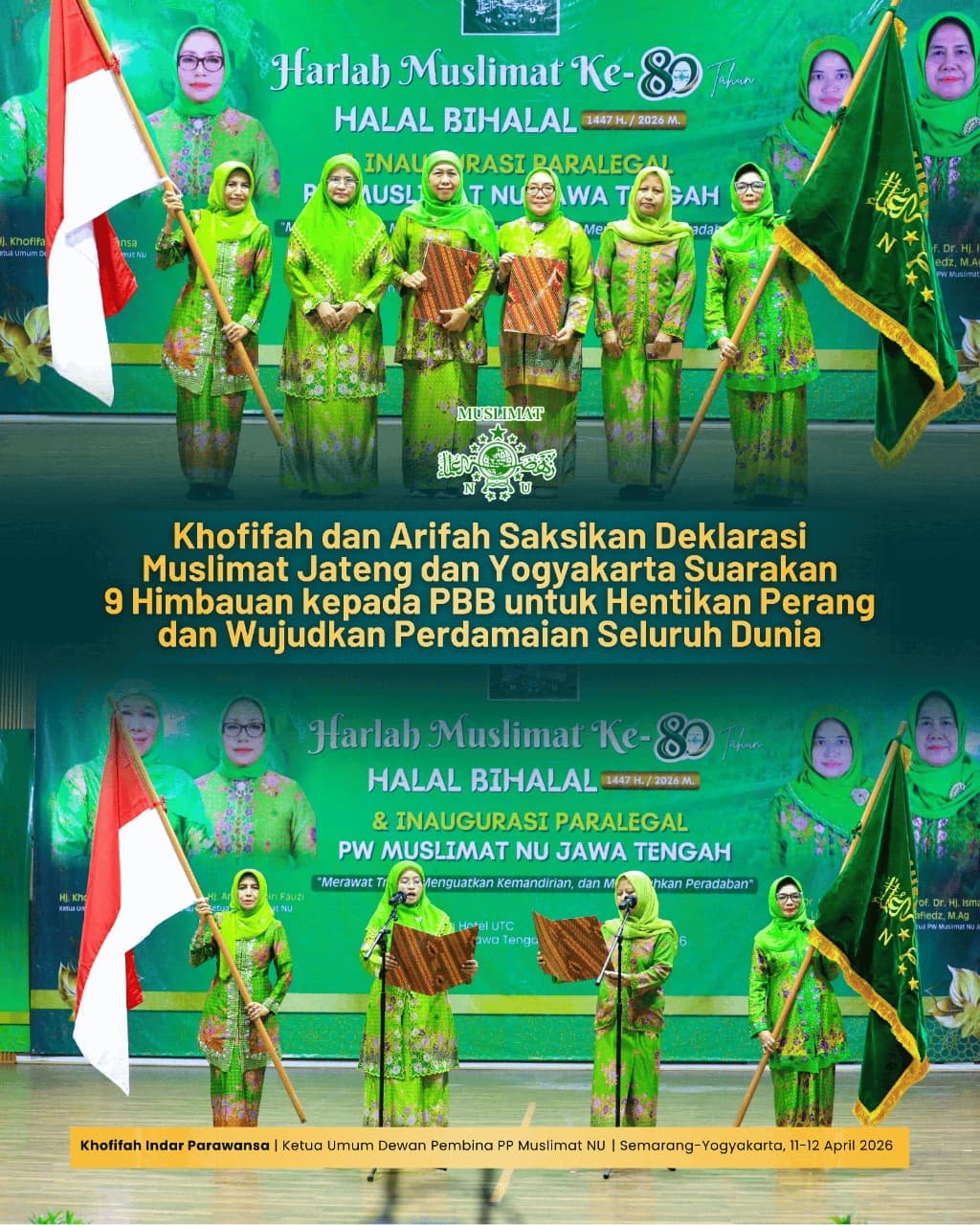 Seruan tersebut disampaikan bertepatan dengan pengukuhan paralegal Muslimat Nahdlatul Ulama se-Jawa Tengah di UTC Convention Hotel, Semarang, Sabtu (11/4) dan pengukuhan paralegal Muslimat Nahdlatul Ulama se-Yogyakarta di UIN Sunan Kalijaga Yogyakarta, Minggu (12/4/) yang juga menjadi momentum penguatan peran perempuan dalam akses keadilan sekaligus diplomasi kemanusiaan di tingkat global.