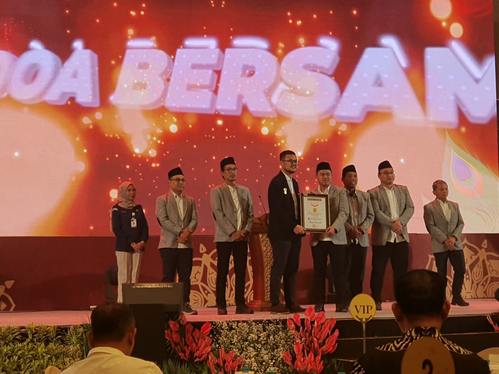 Perwakilan MURI saat menyerahkan piagam penghargaan rekor MURI distribusi logistik secara serentak terbanyak ke 666 kecamatan di Jatim kepada ketua KPU Jatim Aang Khunaifi (ft/fathis)