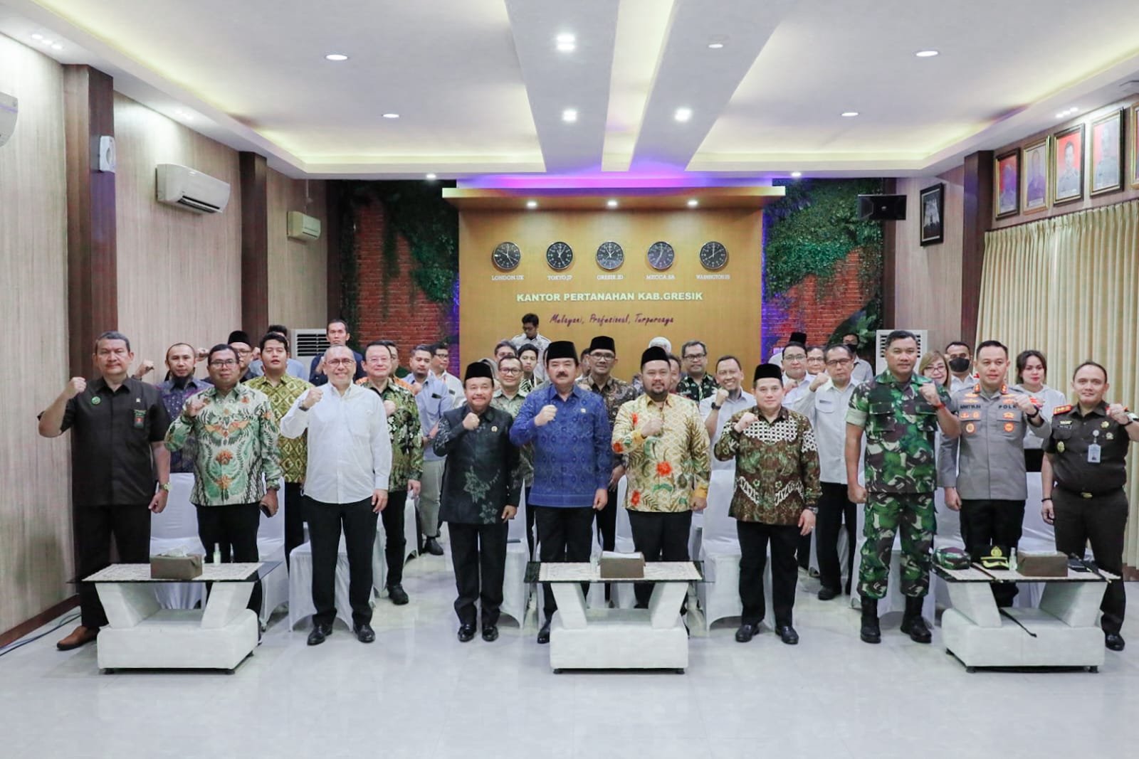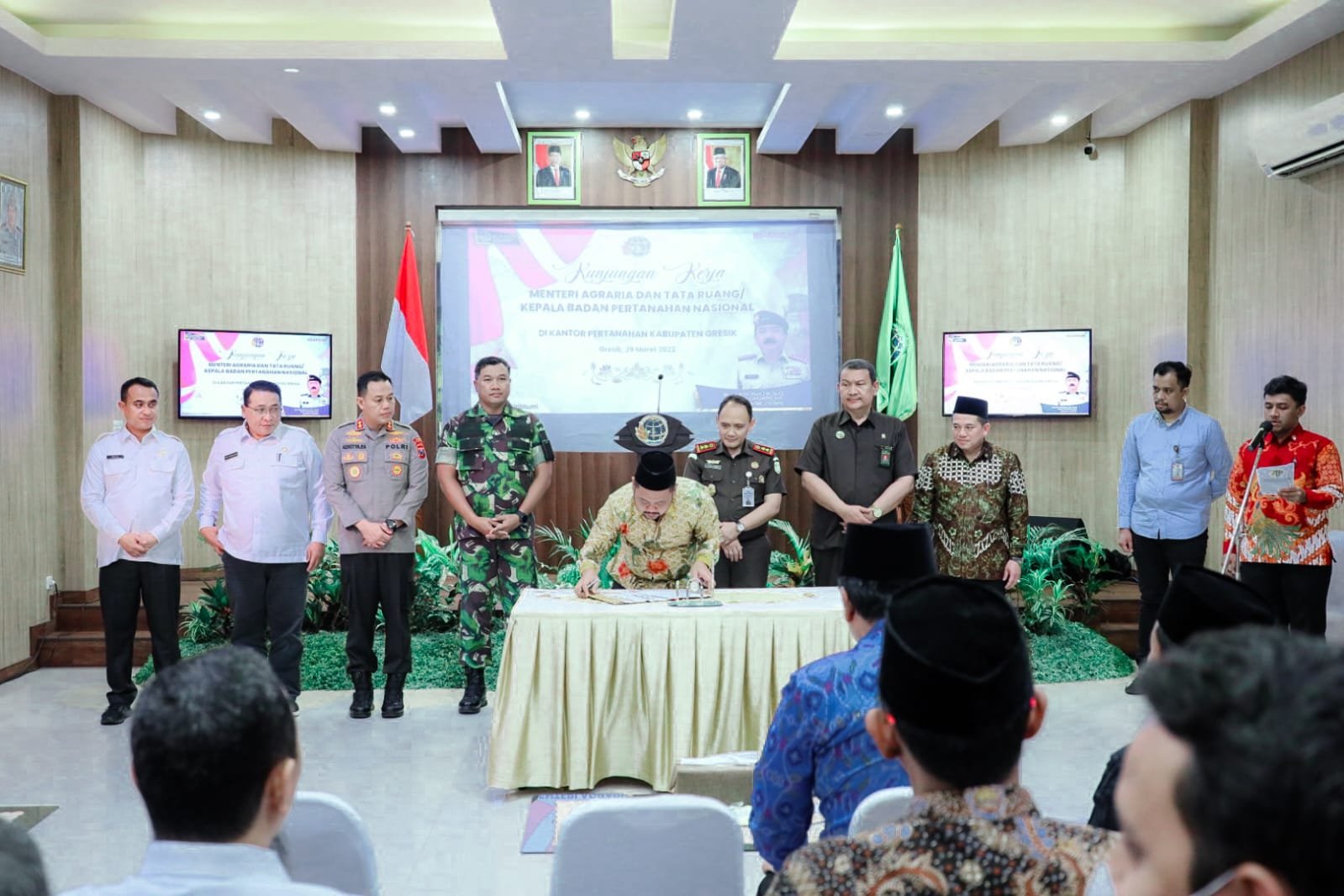 Setelah dari kantor PCNU dan Muhammadiyah, rombongan Menteri ATR/BPN bersama Gus Yani dan Forkopimda, bergerak menuju Kantor BPN Gresik. Disana, Menteri ATR/BPN menyaksikan penandatanganan perjanjian kerjasama pembentukan tim terpadu dalam rangka mewujudkan Gresik lengkap.