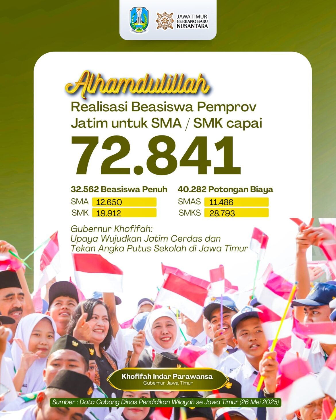 Dari semula 56.647 siswa, kini berdasarkan data terakhir UPT Teknologi Informasi dan Komunikasi Pendidikan (TIKP) Dinas Pendidikan Jatim, meningkat menjadi 72.841 beasiswa penuh dan pendidikan terjangkau untuk calon siswa siswi SMA/SMK Swasta di Jawa Timur.