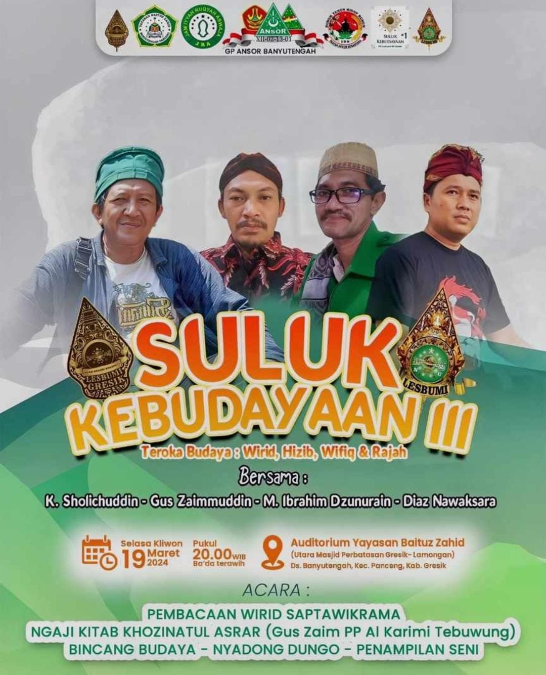 Melalui Lembaga Seniman Budayawan Muslimin Indonesia (Lesbumi) Gresik malam ini menggelar acara dengan bertajuk Suluk Kebudayaan 3 Teroka Budaya : Wirid, Hizib, Wifiq dan Rajah. Kegiatan ini bertempat di Auditorium Yayasan Baituz Zahid Banyutengah Panceng Gresik. (19/03/2024 Malam)