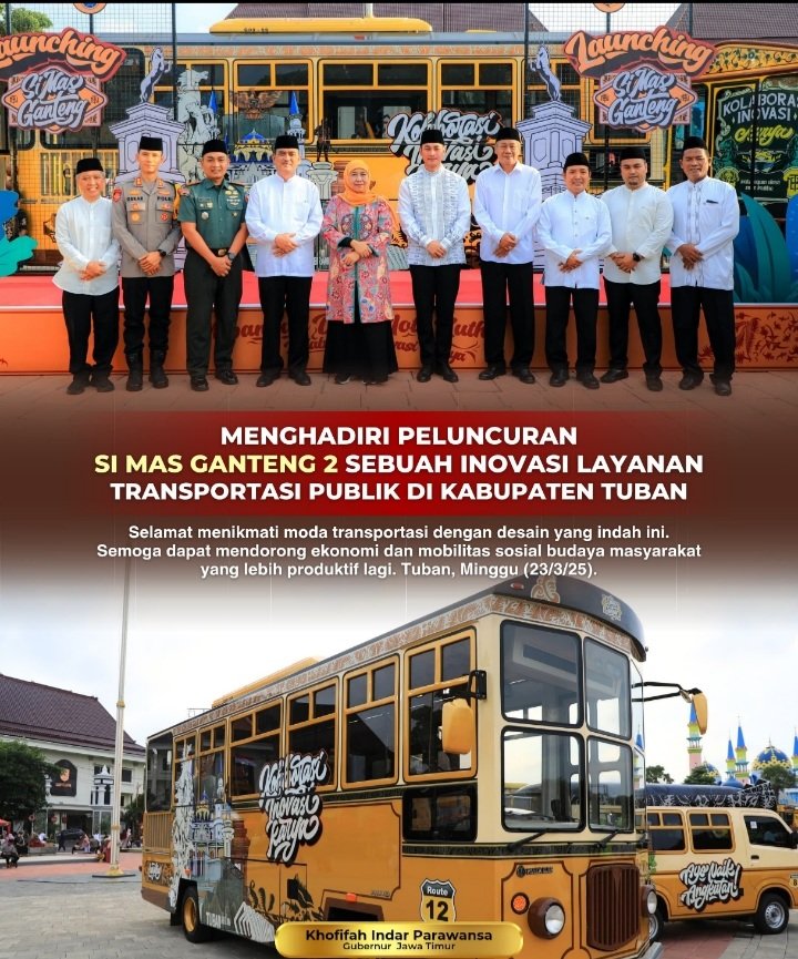 Peluncuran Si Mas Ganteng 2 ditandai dengan pemecehan kendi oleh Gubernur Khofifah bersama Bupati Tuban. Si Mas Ganteng 2 ini diluncurkan dalam rangka meningkatkan kualitas pelayanan transportasi publik kepada masyarakat secara terintegrasi.