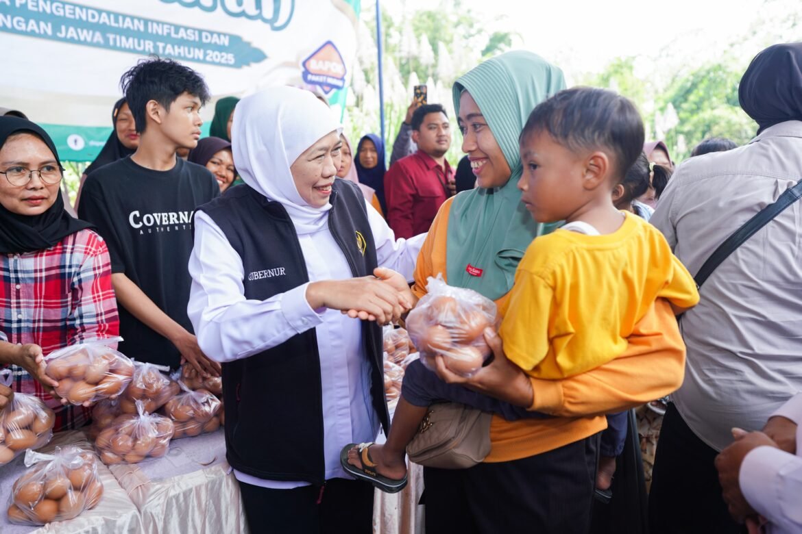 Saat meninjau pasar murah, Khofifah menyempatkan diri menyapa masyarakat dan membagikan telur kepada ibu hamil serta balita, serta memberikan beras kepada lansia.