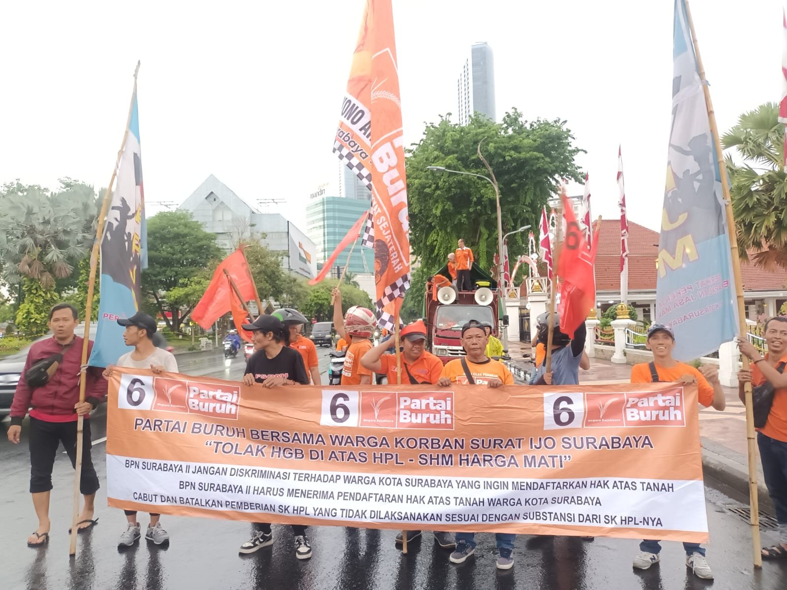 Untuk mendorong percepatan reforma agraria di Kota Surabaya, hari ini Kamis (18/1/2024) Partai Buruh bersama warga kota Surabaya korban ‘Surat Ijo’ melakukan aksi demonstrasi di Kantor Pertanahan Surabaya II di Jl. Krembangan Barat No. 57 Kota Surabaya dan di Balaikota Surabaya, Jl. Walikota Mustajab No. 59 Kota Surabaya.