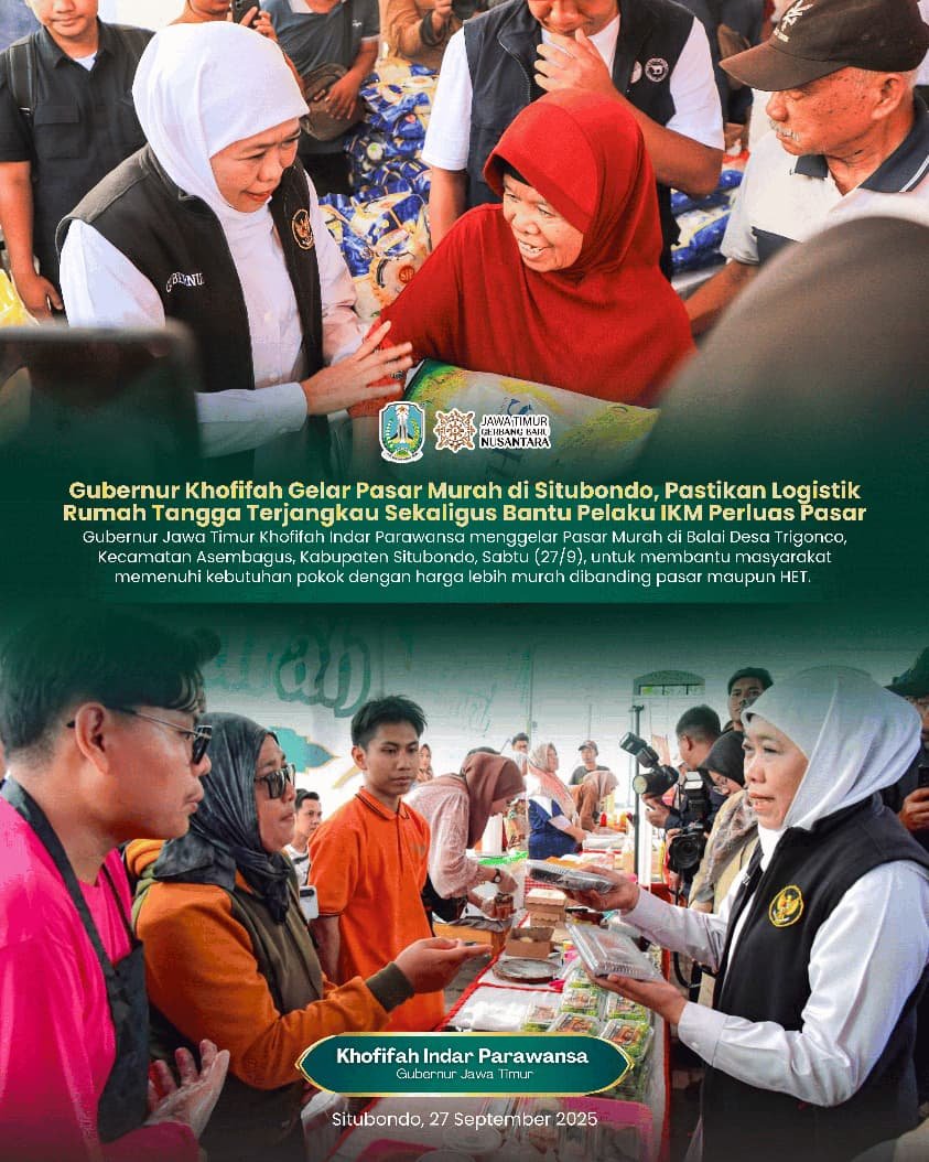 SITUBONDO.SabdaNews.com – Gubernur Jawa Timur Khofifah Indar Parawansa terus menggencarkan gelaran pasar murah di berbagai daerah. Kali ini, pasar murah titik ke-115 tahun 2025 digelar di Balai Desa Trigonco, Kecamatan Asembagus, Kabupaten Situbondo, Sabtu (27/9/2025).