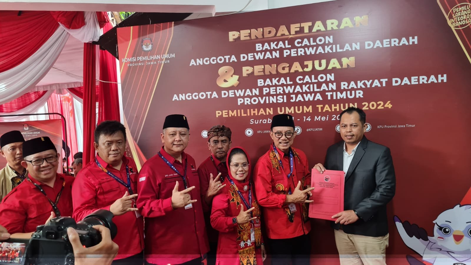 Kendati hujan deras mengguyur Kota Surabaya, pawai budaya dalam rangka menyemarakkan pendaftaran Bacaleg DPRD Jatim tidak mengendorkan semangat kader PDI Perjuangan Jatim yang dipimpin langsung Pelaksana Harian (Plh) Ketua DPD PDI Perjuangan Jatim, Budi Sulistiyono dan Sekertaris PDI Perjuangan Sri Untari Bisowarno jalan kaki dari kantor DPD PDI Perjuangan Jatim menuju kantor KPU Jatim yang berjarak lebih kurang 3 km.