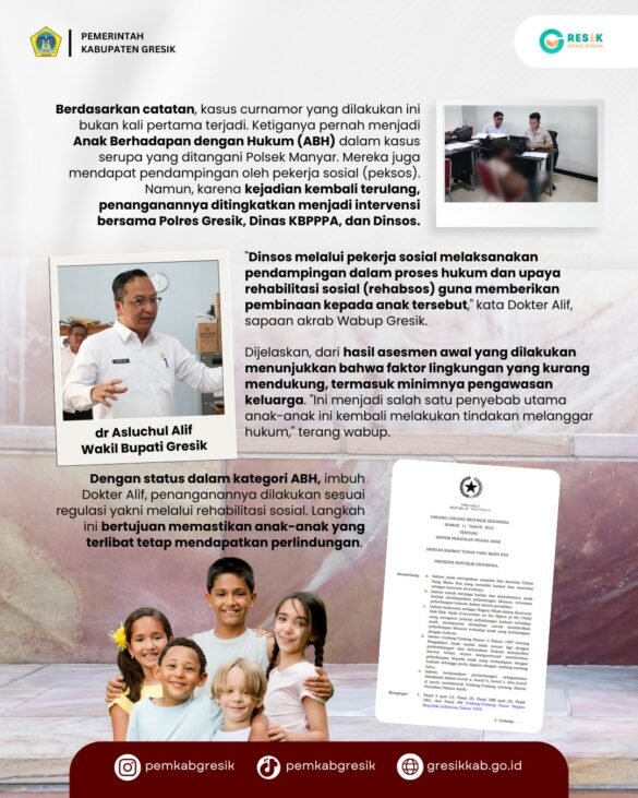Namun, karena kejadian kembali terulang, penanganannya ditingkatkan menjadi intervensi bersama Polres Gresik, Dinas KBPPPA, dan Dinsos. Wakil Bupati Gresik, dr Asluchul Alif mengungkapkan, Kamis (  19/3/ 2025) saat ini Dinas KBPPPA Gresik melakukan pendampingan dalam proses hukum. Kemudian asesmen untuk penanganan lebih lanjut, serta koordinasi langsung dengan pihak keluarga ABH.,