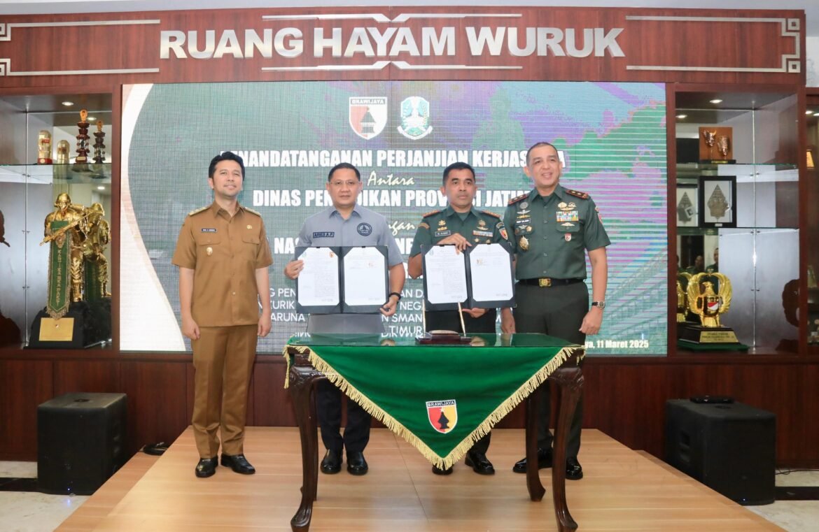 Perjanjian tersebut ditandai dengan penandatanganan PKS oleh Kepala Dinas Pendidikan Jatim Aries Agung Paewai bersama Pangdam V/Brawijaya, Mayjen TNI Rudi Saladin dan disaksikan langsung oleh Wakil Gubernur Jatim Emil Elestianto Dardak di Gedung Hayam Wuruk Kodam V/Brawijaya, Selasa (11/3/2025).