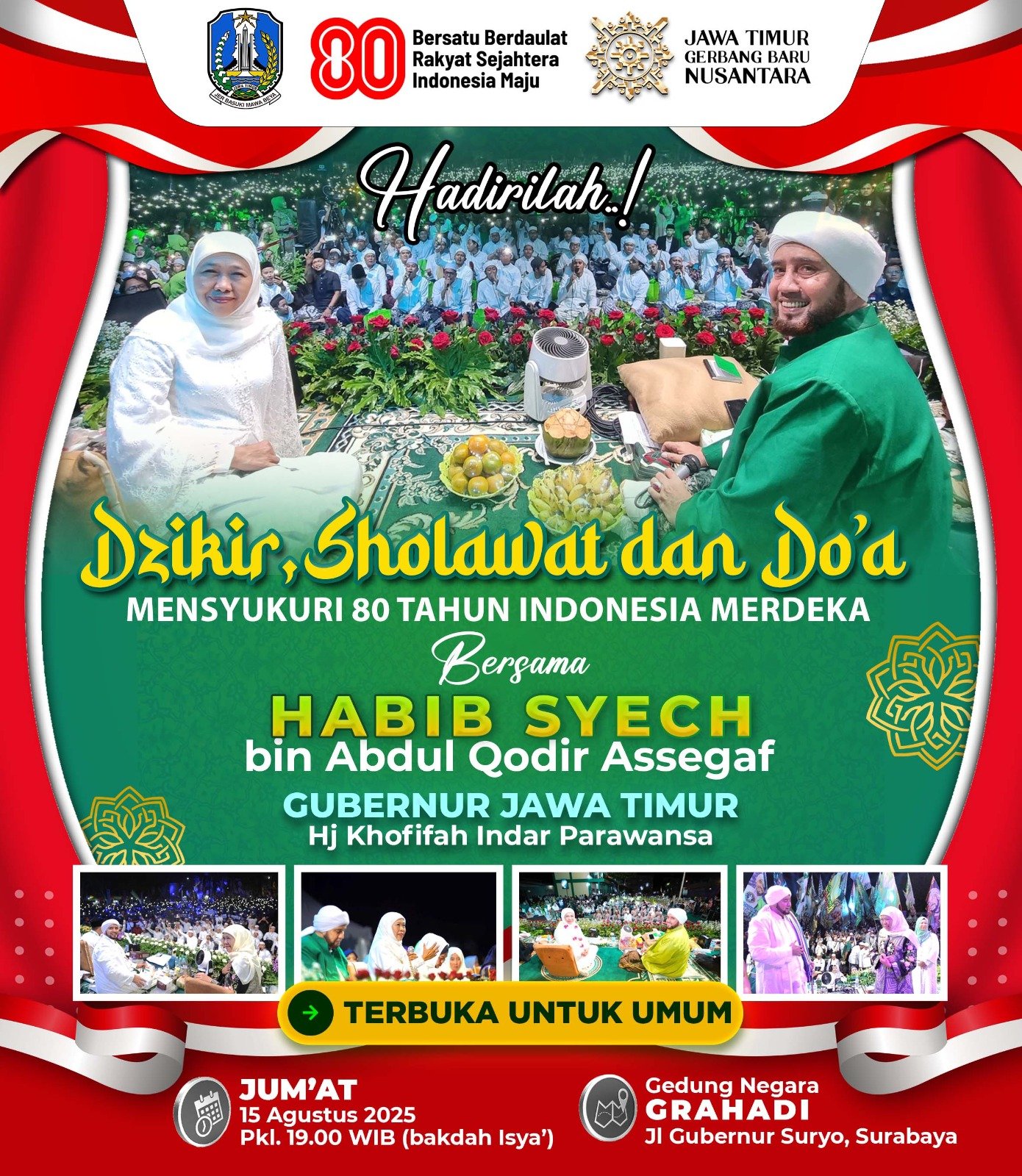 SabdaNews.com- Untuk menyambut HUT Ke-80 Proklamasi Kemerdekaan Indonesia, Pemprov Jawa Timur menggelar “Dzikir, Sholawat, dan Doa Mensyukuri 80 Tahun Indonesia Merdeka” bersama Habib Syech di halaman Gedung Negara Grahadi, Jl Gubernur Suryo, Surabaya pada Jum’at, 15 Agustus 2025 pukul 19.00 WIB (bakda Isya’). Kegiatan dibuka untuk umum. Oleh karena itu saya mengajak masyarakat Jawa Timur rame rame hadir pada dzikir, sholawat dan do’a bersama.