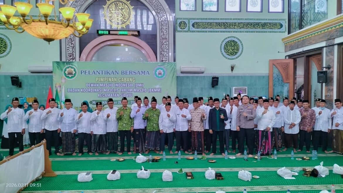 GRESIK, SabdaNews.com – Pimpinan Cabang Dewan Masjid Indonesia (DMI) dan Badan Koordinasi Majelis Taklim Masjid (BKMM) Kecamatan Sidayu resmi dilantik dalam sebuah acara yang digelar di Masjid Jami’ Darussalam Wadeng, Rabu (11/02/2026). Kegiatan dimulai pukul 08.00 WIB dan berlangsung khidmat. Acara tersebut dihadiri oleh Pimpinan Daerah (PD) DMI dan BKMM Kabupaten Gresik, Forum Koordinasi Pimpinan Kecamatan (Forkopimcam) Sidayu, tokoh masyarakat, serta seluruh jajaran pengurus DMI dan BKMM Kecamatan Sidayu.
