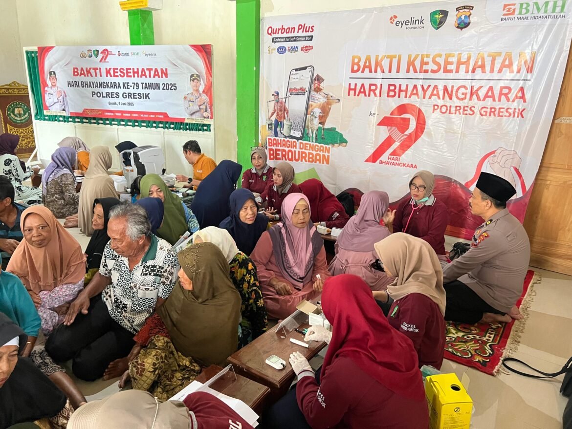 GRESIK ,SabdaNews.com- Dalam rangka memperingati Hari Bhayangkara ke-79 Tahun 2025, Polres Gresik menggelar kegiatan Bakti Sosial Pelayanan Kesehatan Gratis bagi masyarakat dan santri pada Senin, 9 Juni 2025, bertempat di Pondok Pesantren Hafiz Al-Qur’an, Desa Banyu Urip, RT 7 RW 3, Kecamatan Kedamean, Kabupaten Gresik.