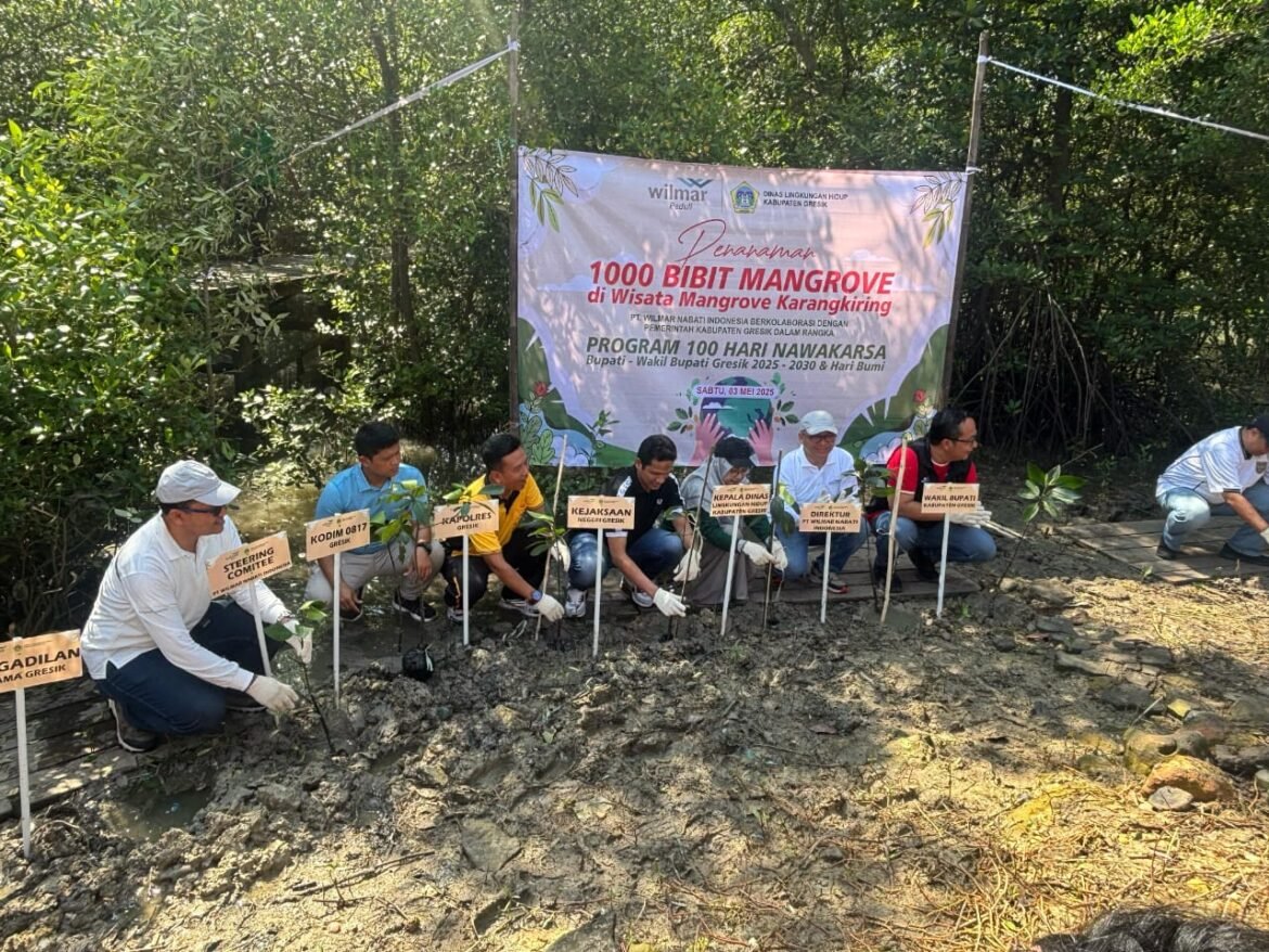GRESIK, SabdaNews.com– Pemerintah Kabupaten (Pemkab) Gresik melalui Dinas Lingkungan Hidup (DLH) bersama PT Wilmar Nabati Indonesia melakukan penanaman 1.000 pohon mangrove di kawasan Wisata Mangrove Karangkiring, Kabupaten Gresik. Penanaman pohon mangrove ini sebagai upaya pelestarian lingkungan serta menjaga ekosistem alam.