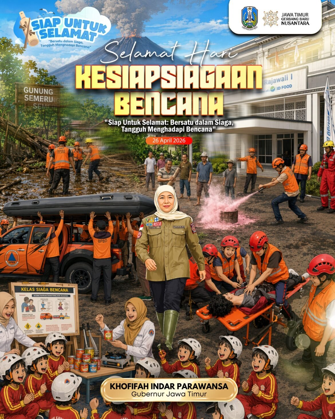 “Di peringatan Hari Kesiapsiagaan Bencana kali ini, mari bersama-sama memastikan kesiapsiagaan, mitigasi, serta langkah konkret dalam melindungi masyarakat Jawa Timur. Oleh karena itu, seluruh kepala daerah diminta bergerak proaktif sebelum puncak kemarau terjadi,” tegas Khofifah pada Minggu (26/4/2026).
