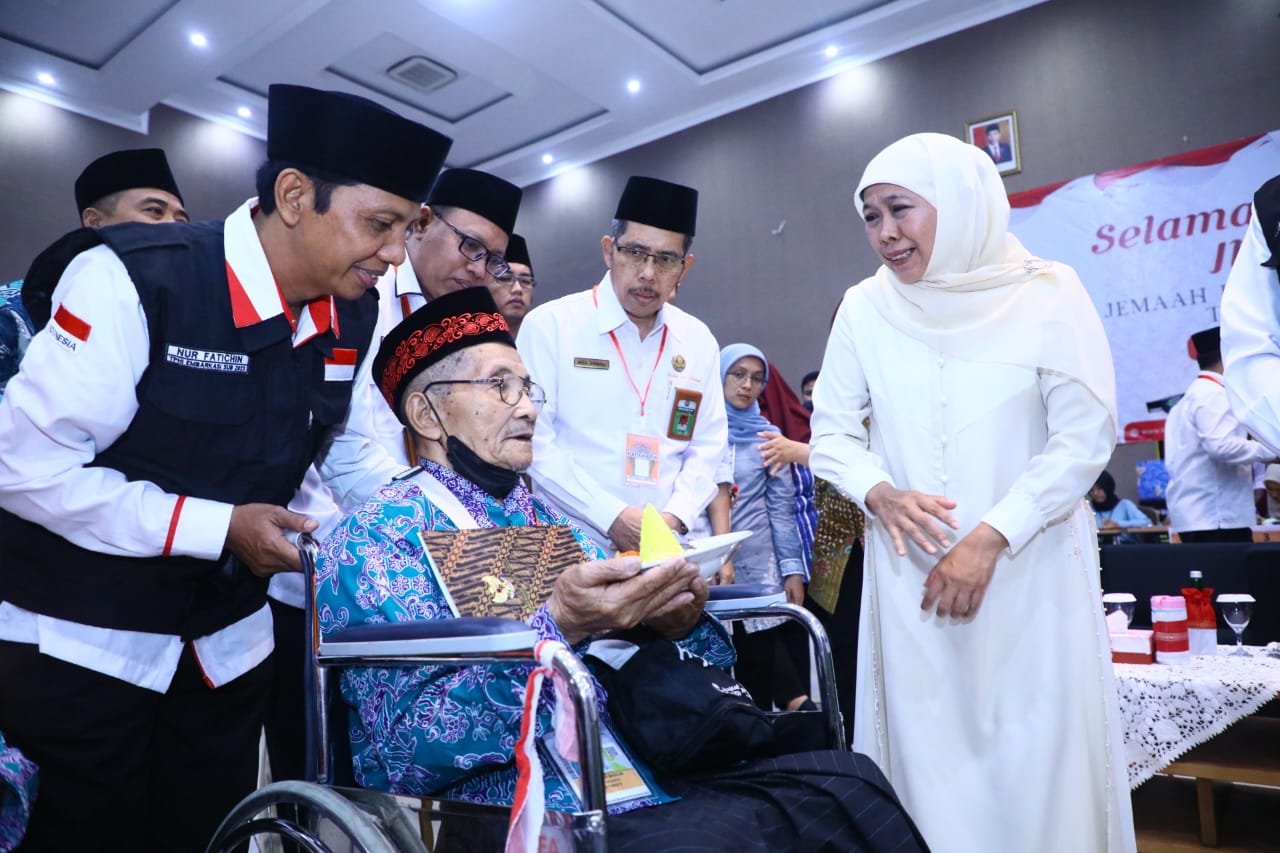 Dalam kesempatan itu, Gubernur Khofifah juga menyiapkan tumpeng untuk dinikmati para calon jemaah haji. Diawali dengan bacaan talbiyah bersama-sama dan shalawat nabi, Gubernur Khofifah secara simbolis memotong tumpeng untuk diberikan kepada jemaah haji lansia dengan usia di atas 80 tahun. Total ada 6 orang lansia diatas usia 80 tahun di kloter 17 yang akan berangkat menuju Madinah pada hari ini.
