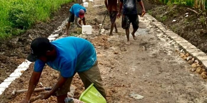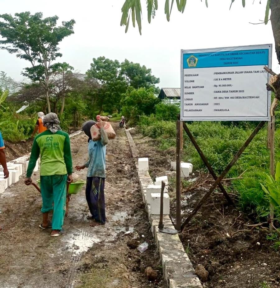 GRESIK ,SabdaNews.com- Pemerintah Desa (Pemdes) Racitengah Kecamatan Sidayu Kabupaten Gresik terus melakukan pembangunan infrastruktur untuk menunjang kegiatan warga. Salah satunya membangun pengerasan Jalan Usaha Tani (JUT) dengan panjang 135 Meter dan lebar 4 meter.