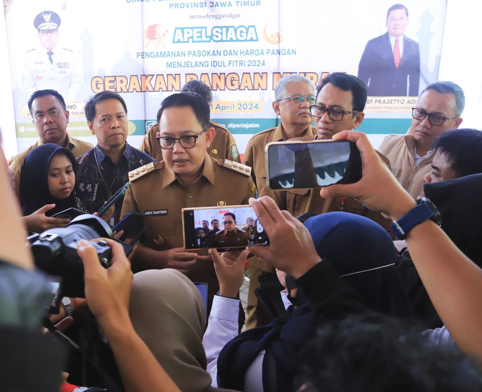 SabdaNews.com – Penjabat (Pj) Gubernur Jawa Timur Adhy Karyono menghadiri Apel Siaga Pengamanan Pasokan dan Harga Pangan Jelang Idul Fitri 2024 “Gerakan Pangan Murah” secara virtual bersama Badan Pangan Nasional di Ruang Rapat Kantor Dinas Pertanian Prov. Jatim, Senin (1/4/2024).