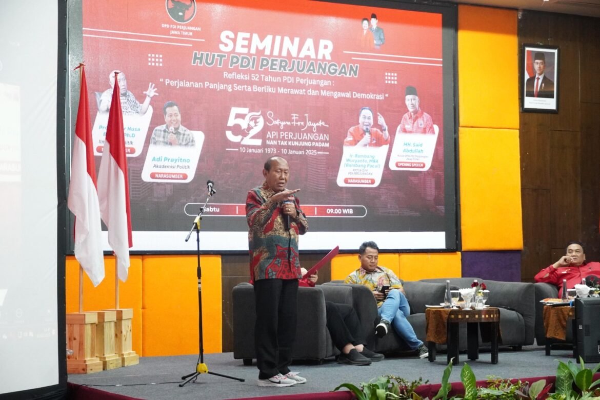 Selain Prof. Ikrar, seminar mengusung tema “Perjalanan Panjang Serta Berliku Merawat dan Mengawal Demokrasi” itu menghadirkan narasumber, pengamat politik Adi Prayitno M.Si, dan Ketua DPP PDI Perjuangan Ir Bambang Wuryanto MBA atau Bambang Pacul.