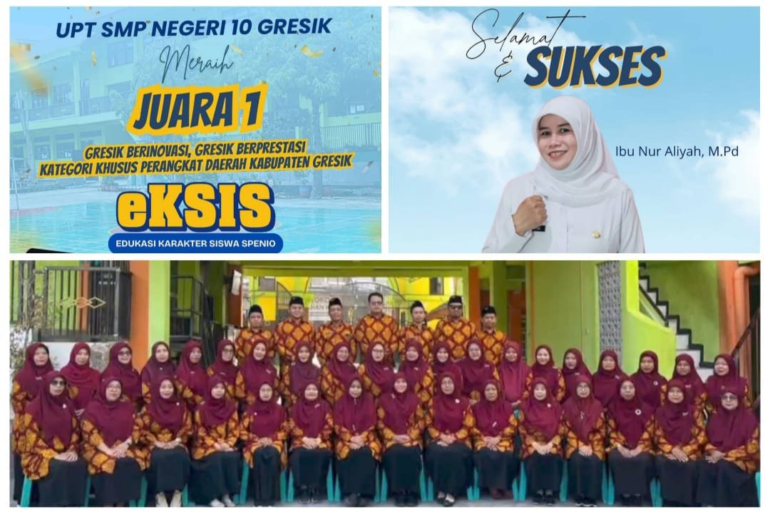 GRESIK ,SabdaNews.com- GEMILANG! UPT SMP Negeri 10 Gresik kembali menorehkan tinta emas prestasi! Betapa tidak, UPT SMP Negeri 10 (SPENIO) Gresik berhasil meraih Juara 1 dalam Lomba Gresik Inovasi Kompetisi (GIK) 2025 yang diselenggarakan BAPPEDA kategori Perangkat Daerah Kabupaten Gresik.  Dalam ajang bergengsi di tingkat Kabupaten Gresik tersebut, UPT SMP Negeri 10 Gresik meraih Juara 1 Kategori Khusus, yakni Program “EKSIS” (Edukasi Karakter Siswa SPENIO).