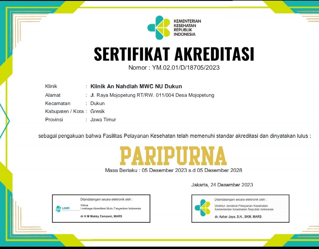 GRESIK, SabdaNews.com- Klinik Annahdlah MWC NU Dukun dalam pelayanan kepada pasien mengalami kemajuan baik menejemen mutu dan keselamatan. Hal ini dilihat dari capaian Akriditasi atau penilaian dengan sukses mendapatkan nilai Paripurna. Akriditasi ini menjadi pengakuan terhadap mutu pelayanan Faskes tingkat pertama. Sedangkan Akriditasi Paripurna merupakan predikat hasil penilaian tertinggi. Predikat hasil ini berdasarkan penilaian terhadap menejemen mutu dan keselamatan pasien yang diterapkan di Faskes tingkat pertama. (31/12/2023)