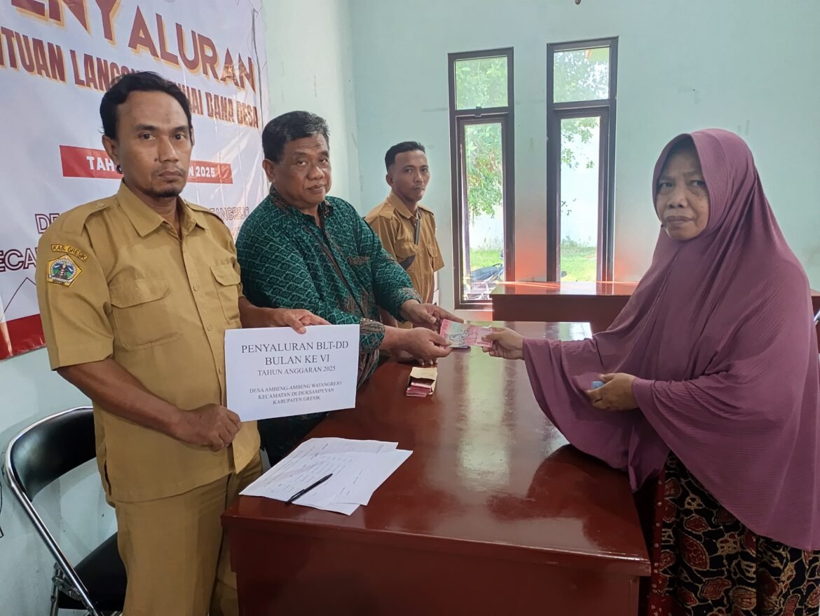 “Untuk penyaluran bantuan langsung tunai dana desa ( BLT DD) tahun anggaran 2025, Desa Ambeng-Ambeng Watangrejo, Duduksampeyan, yang baru saja dilaksanakan, yakni pada 17 April 2025, 16 Mei 2025 dan 10 Juni 2025. Ya dari 39 KPM, masing masing mendapatkan uang tunai Rp300 ribu.