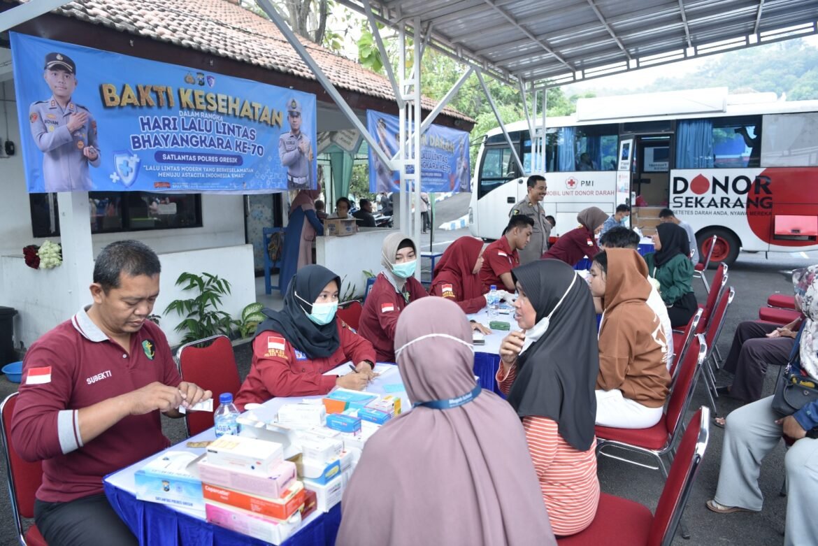 GRESIK ,SabdaNews.com- Dalam rangka menyambut Hari Lalu Lintas Bhayangkara ke-70, Satuan Lalu Lintas (Satlantas) Polres Gresik menggelar bakti kesehatan, donor darah, dan pasar murah di halaman Kantor Satlantas Polres Gresik, Kamis (4/9/2025). Kegiatan dipimpin Wakapolres Gresik Kompol Danu Anindhito Kuncoro Putro, didampingi Kasat Lantas AKP Rizki Julianda Putera Buna, serta Kasidokkes Polres Gresik Iptu Sugioto. Acara ini melibatkan tim medis gabungan dari Sidokkes Polres Gresik dan Palang Merah Indonesia (PMI) Kabupaten Gresik.