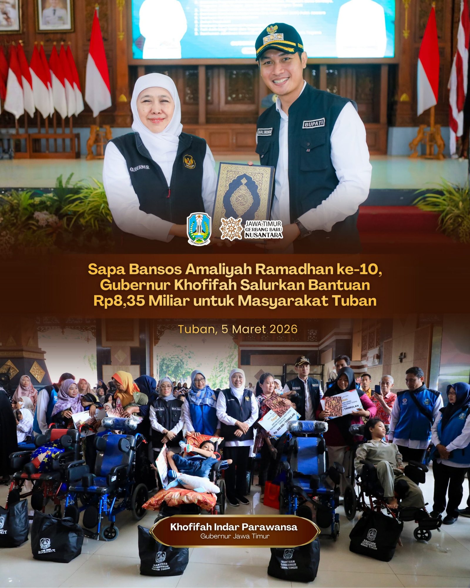 TUBAN.SabdaNews.com – Gubernur Jawa Timur Khofifah Indar Parawansa melanjutkan rangkaian kegiatan Sapa Bansos Amaliyah Ramadan ke-10 dengan menyalurkan bantuan sosial (bansos) Pemerintah Provinsi Jawa Timur kepada masyarakat Kabupaten Tuban senilai Rp8.358.950.000. Penyerahan bantuan tersebut dilaksanakan di Pendopo Kridho Manunggal Kabupaten Tuban, Kamis (5/3/2026).