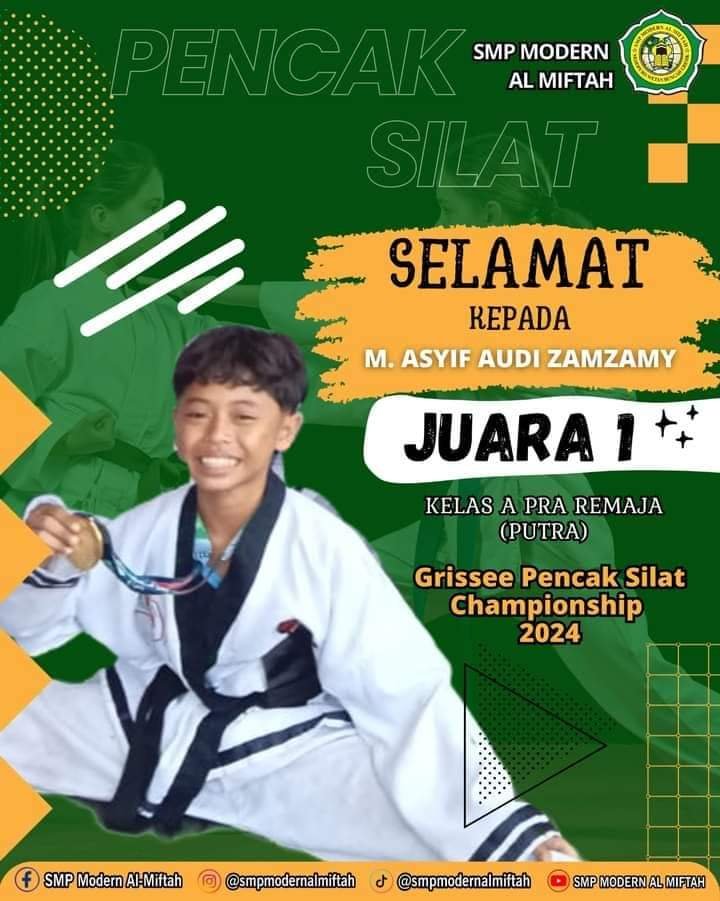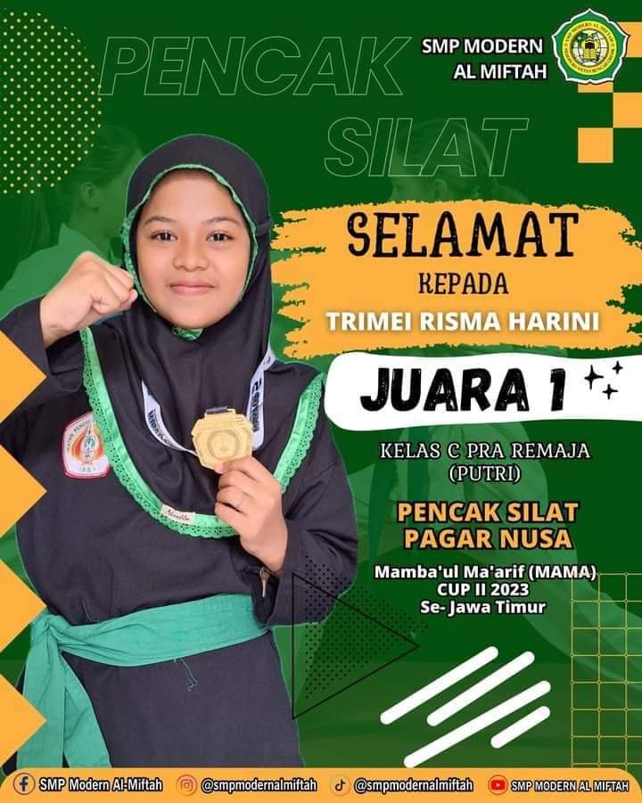 “Tak hanya Pencak Silat, Santri Pesantren Al Miftah juga Juara Bahasa Arab, Pidato Bahasa Inggris dan Bahasa China Tingkat Jawa Timur. Alhamdulillah, kesuksesan para santri dalam meraih prestasi tidak hanya mengharumkan nama Pesantren, namun juga menjadi kebanggaan orang tua santri. Tunggu apa lagi,