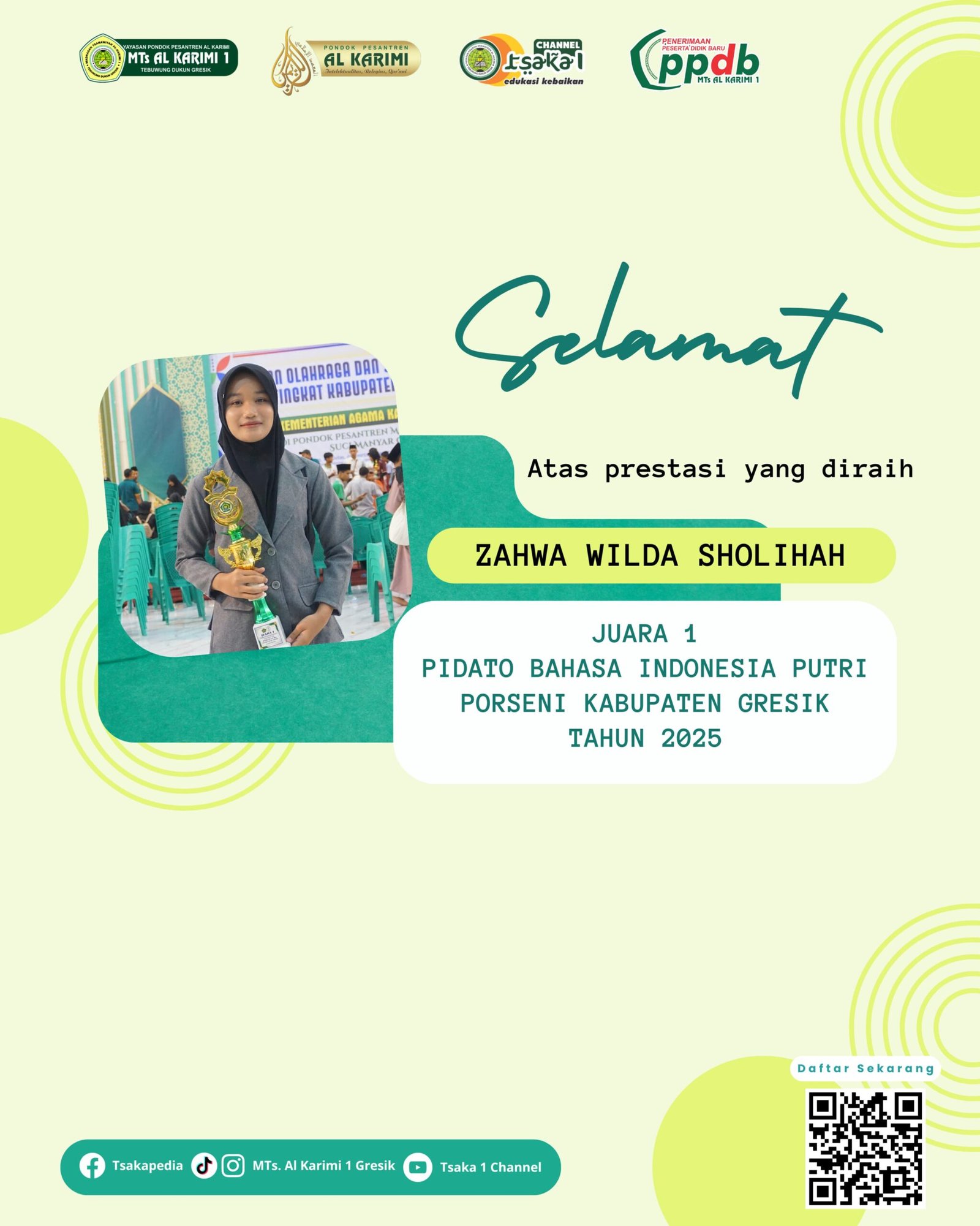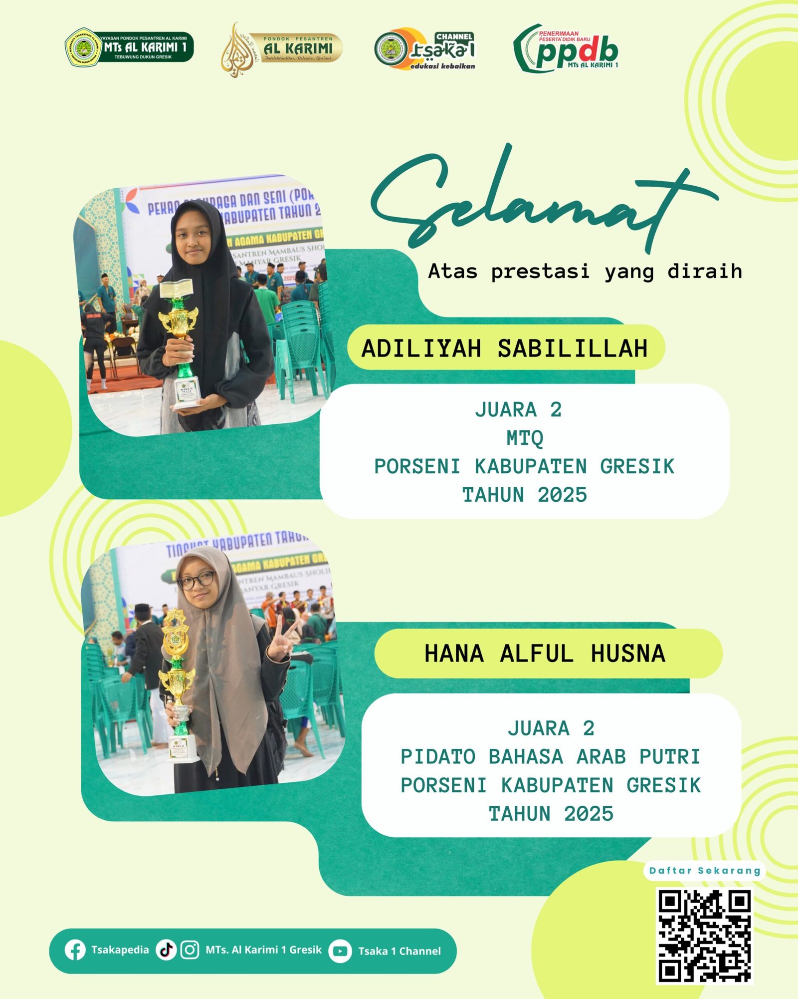 GRESIK, SabdaNews.com- Alhamdulillah penuh rasa Syukur kehadirat Allah SWT. Atas prestasi dan Raihan kejuaraan Porseni Mts Sekabupaten Gresik tahun 2025. Siswa yang berprestasi Mts Alkarimi 1 yakni : 1.Zahwa Wilda Sholihah juara 1 Pidato Bahasa Indonesia Putri Porseni Mts Kabupaten Gresik 2025 2.Adiliyah Sabililah juara 2 MTQ Putri Porseni Mts Kabupaten Gresik 2025. 3.Hana Alful Husna juara 2 Pidato Bahasa Arab Putri Porseni Mts Kabupaten Gresik.