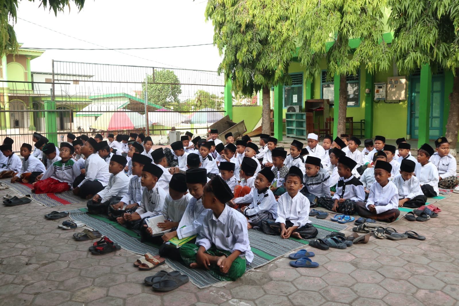 GRESIK, SabdaNews.com- Berpakaian baju serba putih Civitas Akademika Dewan Guru siswa Siswi Madrasah Ibtidaiyah (MI) Alkarimi Tebuwung Dukun Gresik pagi hari ini melaksanakan peringatan Maulid Nabi Muhammad SAW di Halaman Kantor MI Alkarimi (16/09/2025) Kegiatan tersebut menjadi program rutin tahunan dalam Peringatan Hari Besar Islam (PHBI). Menariknya dalam kegiatan ini pembacaan Maulid Dziba’ Sholawat Nabi di lakukan dengan berurutan atau berantai baik dari siswa dan Dari Guru yang semuanya sudah di beri jadwal serta tugas masing masing dan siswa siswa mengikuti lantunan Sholawat Nabi dengan penuh semarak dan Khidmah saling bersautan.