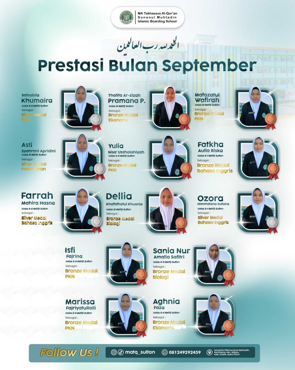 Silver Medal: Bahasa Inggris 🥉 Dellia Khafidhotul Khusnia (XI MATQ) Bronze Medal: Biologi 🥈 Ozora Himmatana Sufaira (X-1 MATQ) Silver Medal: Bahasa Inggris 🥉 Isfi Fajrinaa (X-2 MATQ)