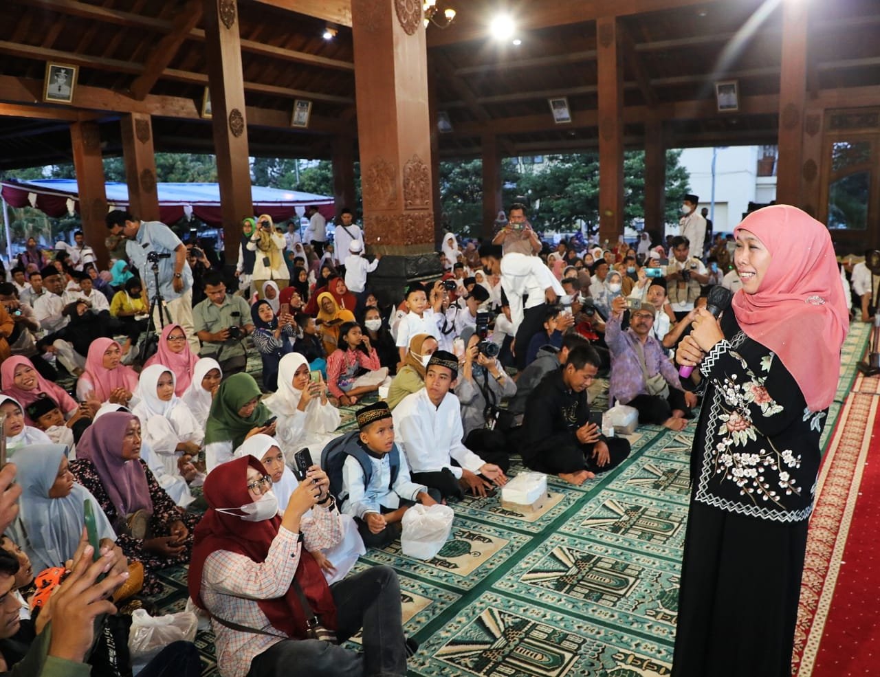 Pada kesempatan yang sama, Gubernur perempuan pertama di Jatim ini juga membagikan 850 kantong beras kepada jemaah salat tarawih Masjid Jami’ Sumenep yang masing-masing menerima 3 kg beras.