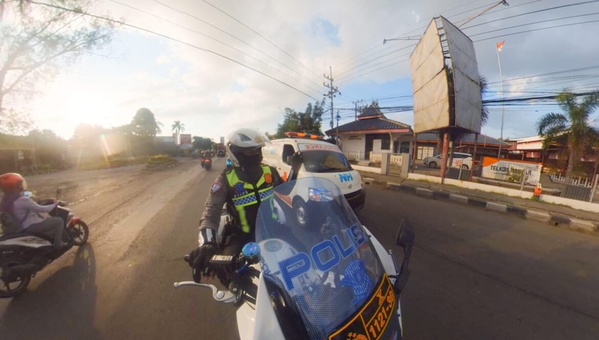 Dengan kecepatan terkendali, Aipda Bambang mengawal ambulans menembus kepadatan lalu lintas sore hari. Kendaraan lain menepi, memberikan jalan, memahami bahwa setiap detik berarti bagi nyawa di dalam ambulans itu.